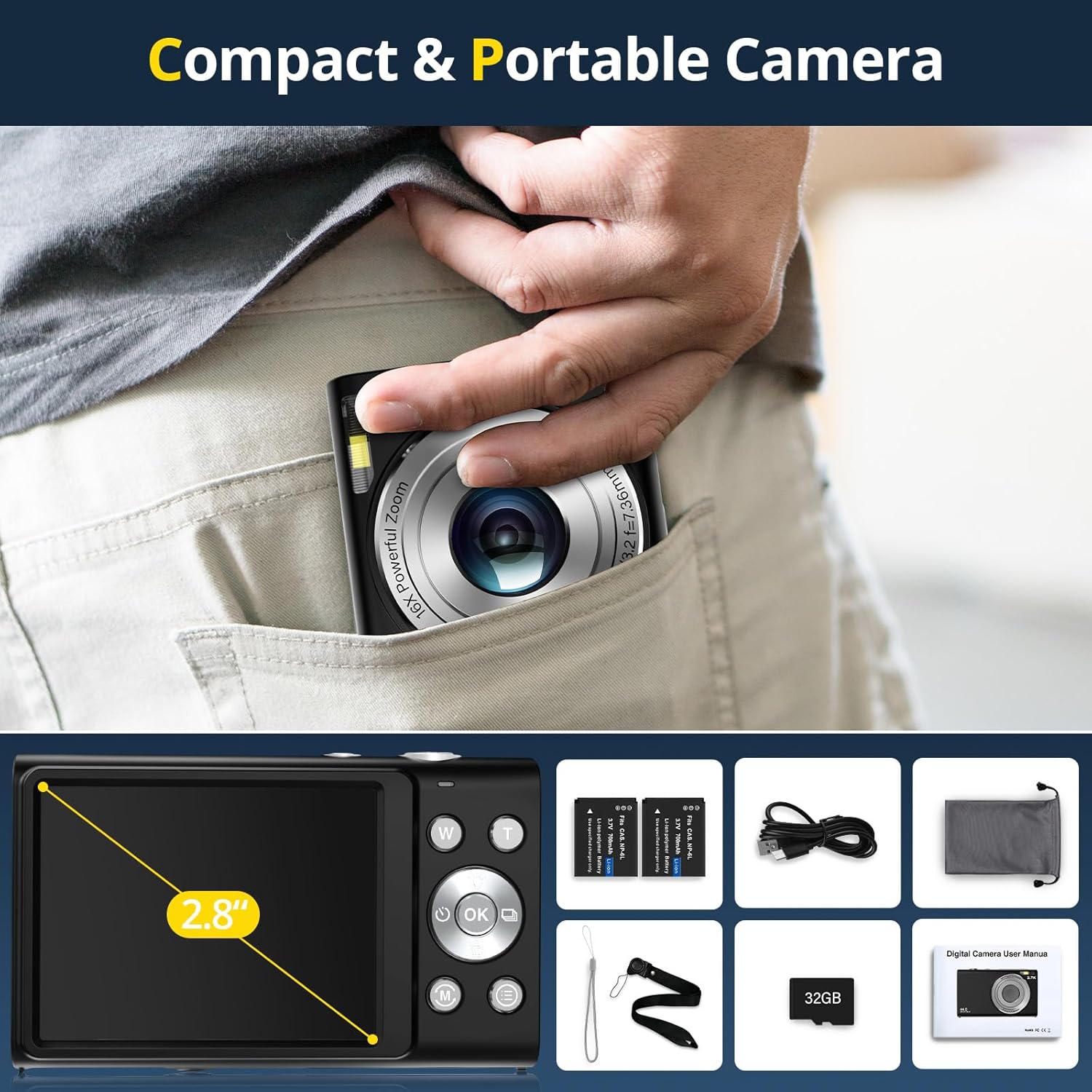 【2.8″ IPS Screen & LED Light】Our compact camera composes your photos with confidence using the 2.8″ IPS screen, which offers a clear view of your subject and camera settings. Additionally, the built-in LED light enhances your shooting capabilities in low-light conditions, ensuring your photos and videos shine in any environment.