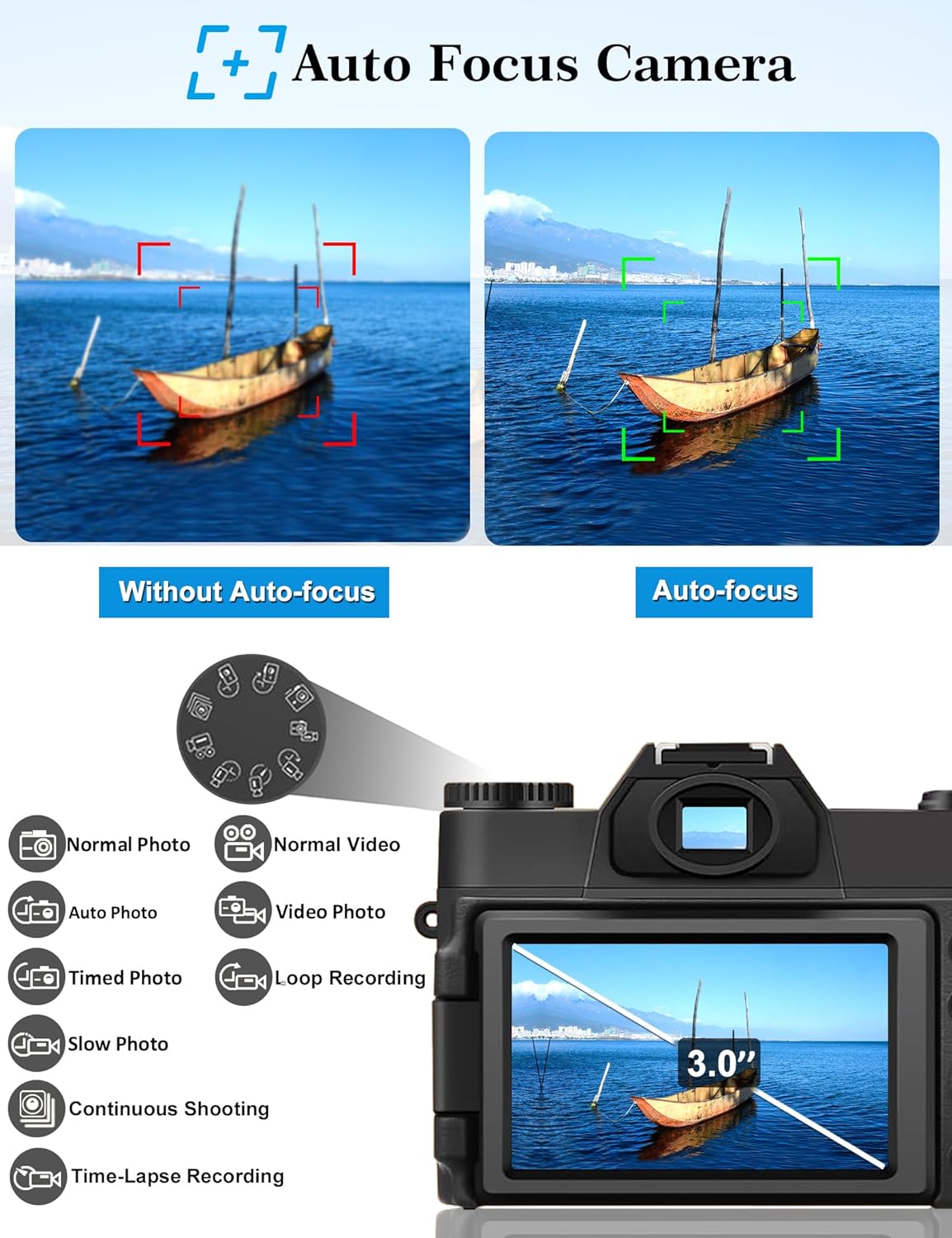 ★【Good Choice for Beginners】The digital camera comes with a 3-inch 180° rotating LCD screen and 3 focus modes to satisfy beginner's desire to explore photography. The camcorder also has an anti-shake function to take clear photos.