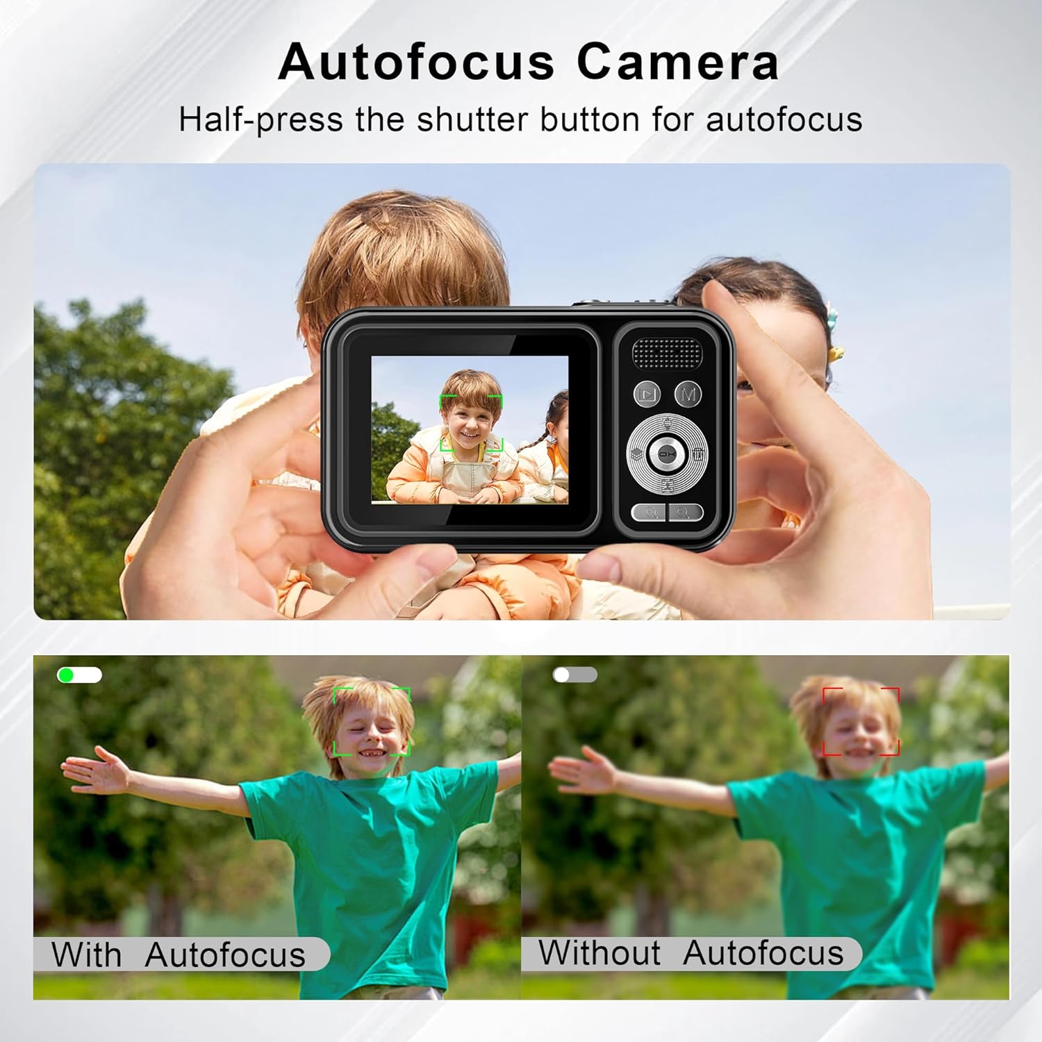 16x Digital Zoom and Auto Focus: This portable digital camera provides innovative 16x zoom capability. Press the shutter button halfway while taking a photo, and press the shutter button again when the focus frame changes from red to green. Equipped with autofocus function, say goodbye to blurry images. You can also use the +/- button to adjust the 16X digital zoom to capture and record every unforgettable moment at any time.