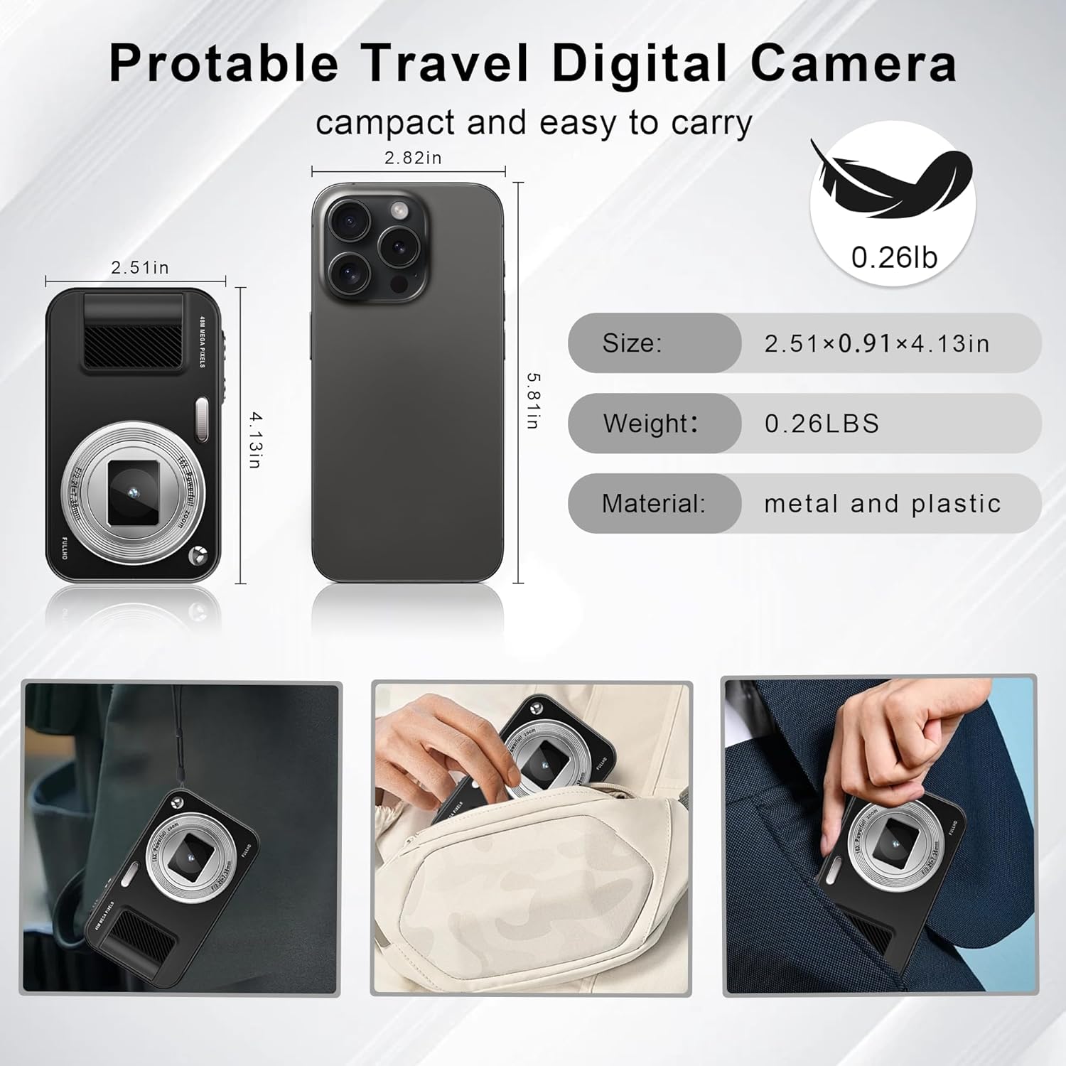 FHD 1080P Video and 48MP Photo: This digital camera is equipped with the newest CMOS image sensor and anti-shake function, which helps capture vivid and clear 48MP images and record stable and smooth videos with FHD 1080P resolution. This camera has a built-in microphone to help you record every wonderful Vlog in your life.