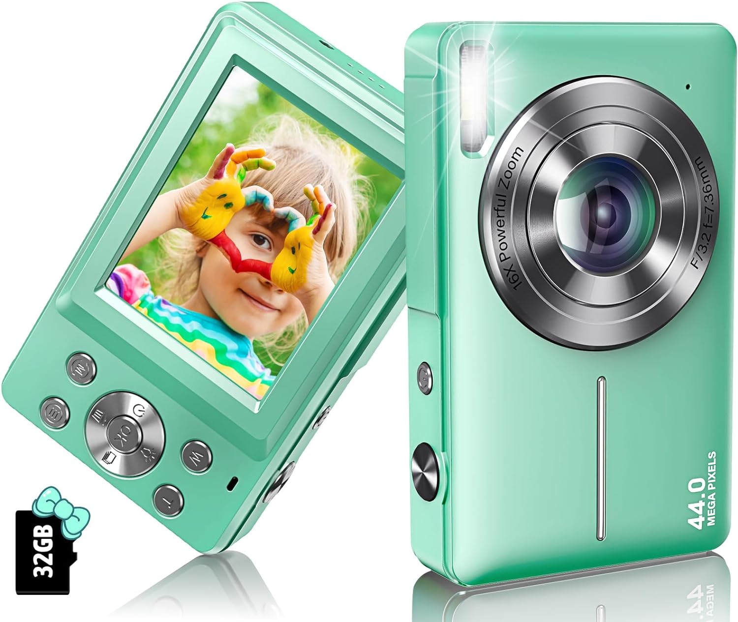 Compact Digital Camera with 16X Zoom & 20 Different Filters: This kids digital camera takes 44MP FHD images and 1080P videos, producing natural colors with vivid and clear details. With 16x digital zoom and 20 different filters, this kids digital camera allows you to capture sharp and clear images even from a distance and gives you different photography experiences.