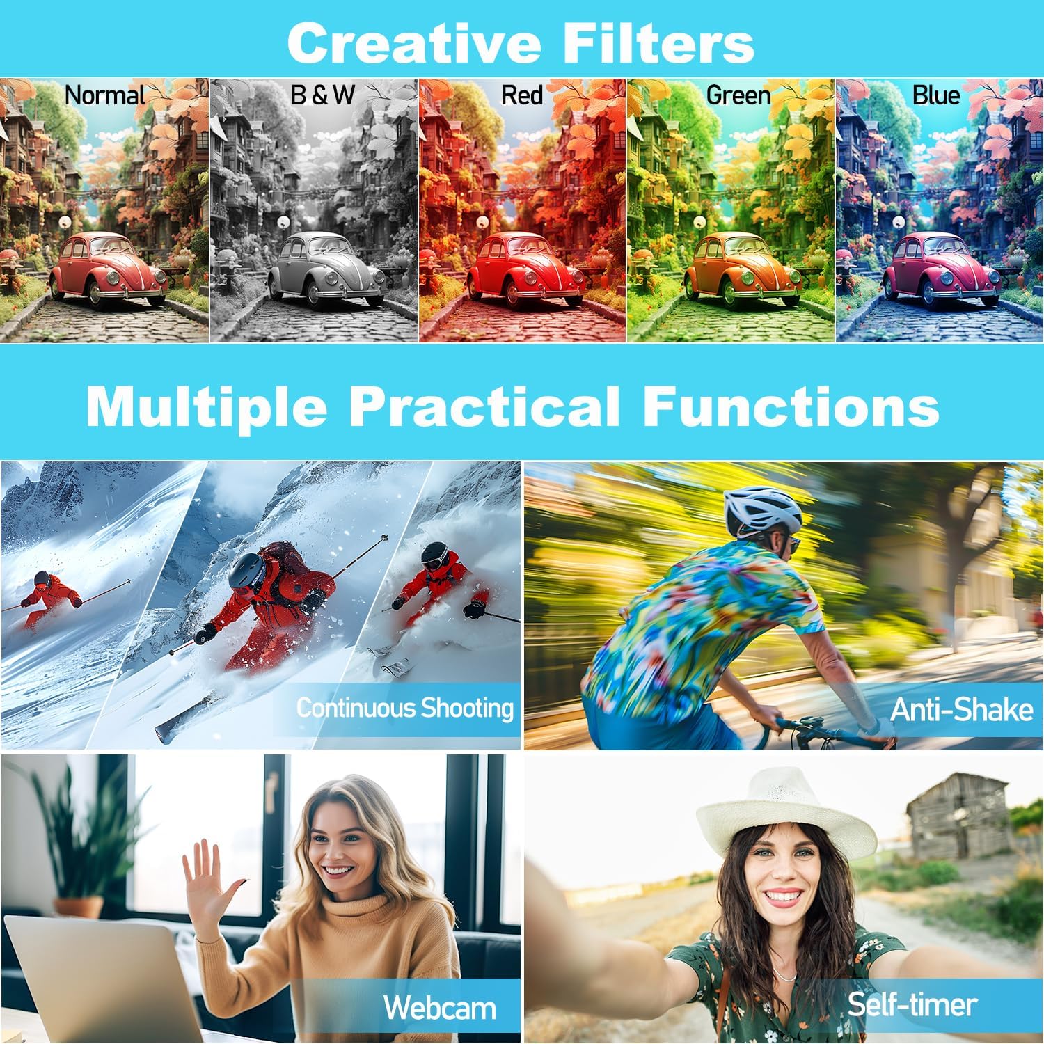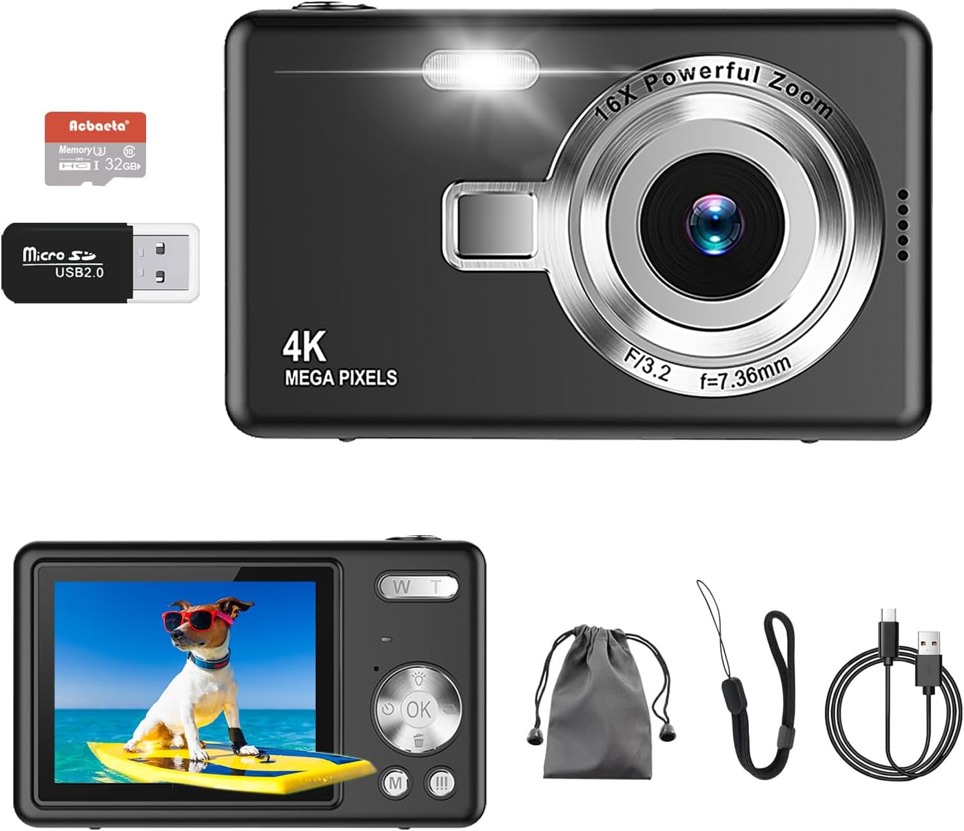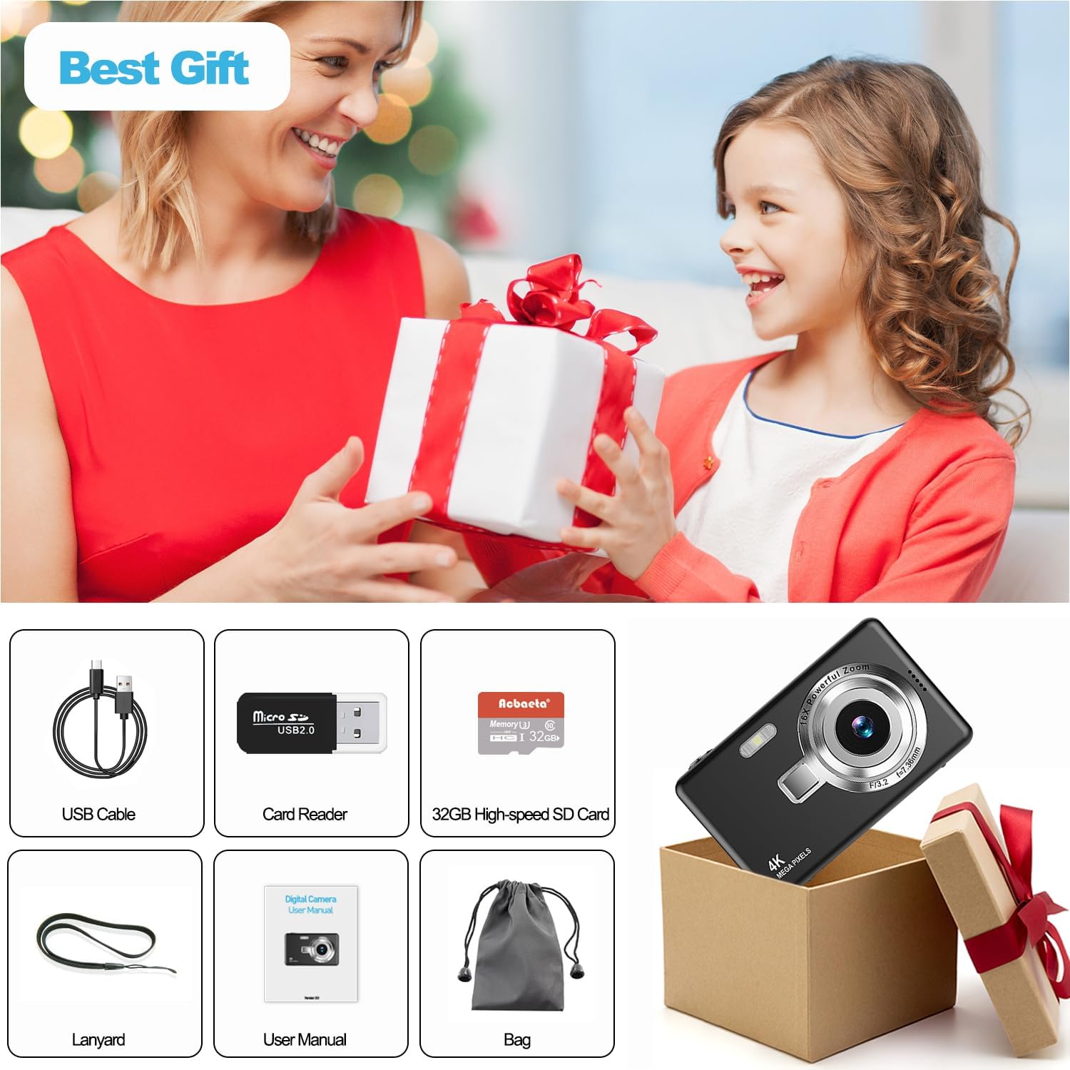 【Complete package】 This portable 4K digital camera includes a high speed SD card of 32 GB and a large built -in battery, which allows you to start shooting and store a lot of photos and videos immediately without having to buy additional cards and batteries, and continue capturing memories. This complete package gives you everything you need for a perfect and pleasant photography and videography experience.