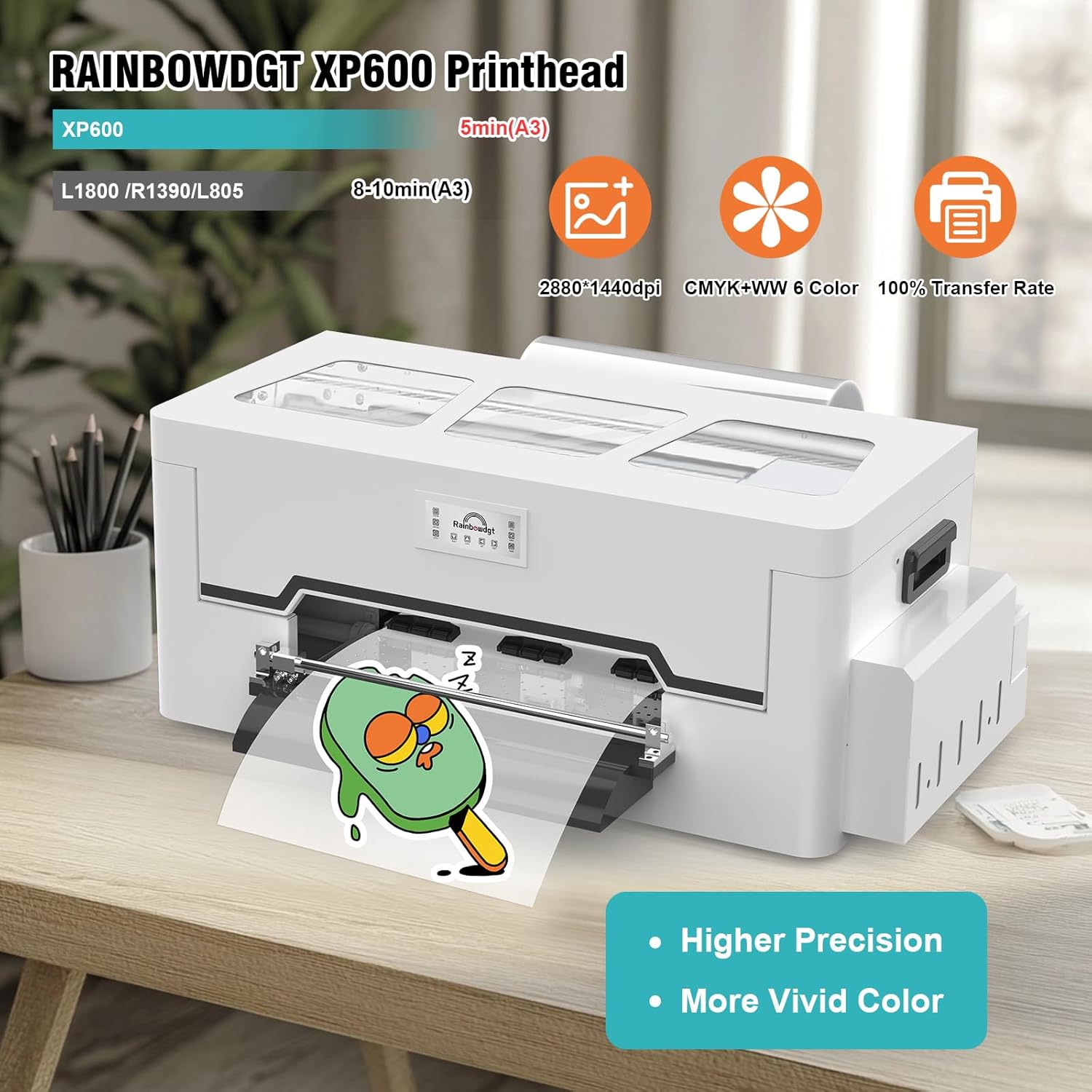 【Exceptional printing speed】 A3 DTF Transfer Machine comes with an XP600 print head of 6 colors, the A3 printer prints a complete A3 sheet in just 5 minutes, which offers twice the printing speed of the print heads L1800 and L805. It also admits the continuous impression of long images with single click operation.