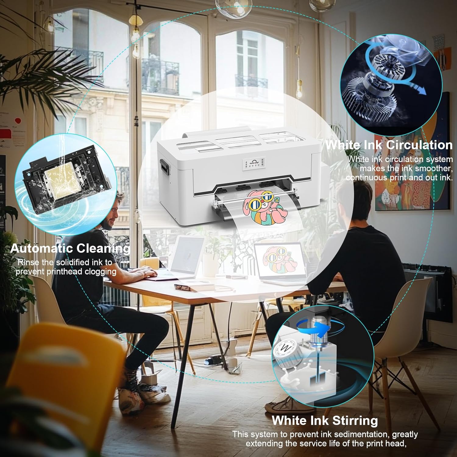 【Say goodbye to block problems】: equipped with a white ink cycle 2 in 1 and an automatic cleaning and hydration device, to ensure that the nozzle is permanent and soft, to avoid the blockage and affect the work. The maintenance cost is reduced considerably, which makes the use of more concern. Enjoy maintenance without problems and uninterrupted productivity