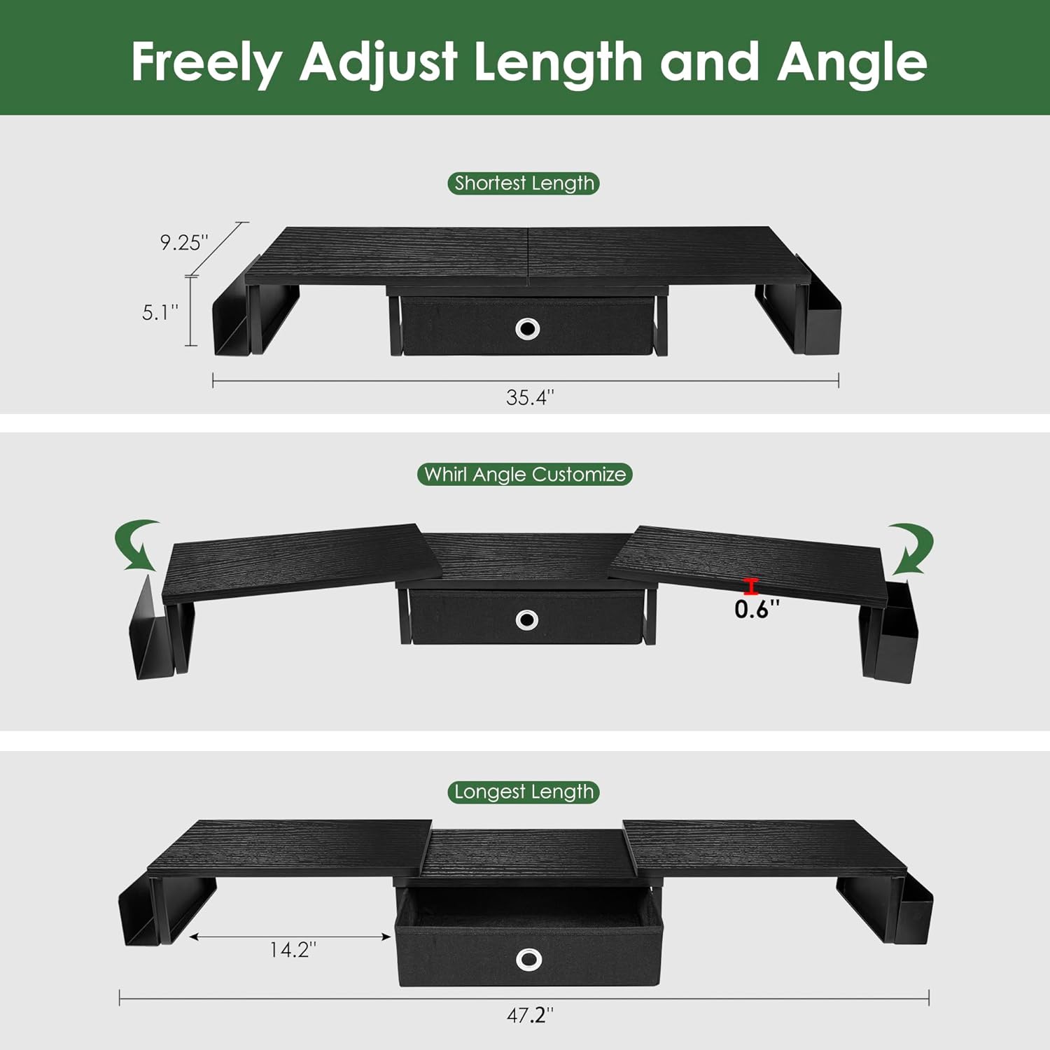 Adjustable angle and length: The length of the monitor support elevator with a drawer can be adjusted from 35.4 to 47.2 inches, and the angle can be adjusted +/- 90 degrees to meet several office needs and obtain a better visualization experience. If you need several computers to work at the same time, you could also choose our Big Extra monitor elevator for 2 monitors.