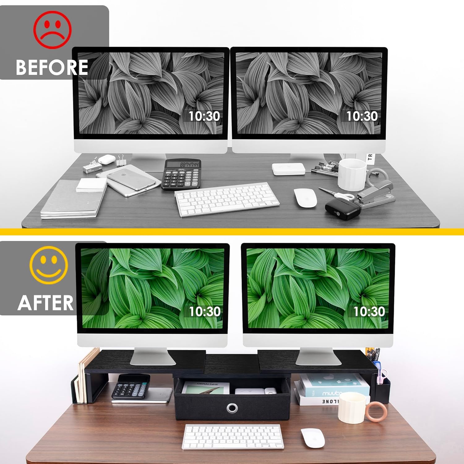 Easy to assemble: It only takes 5 minutes to install this double monitor support for the desktop. Only wear screws to assemble the base frame and join the 2 side boxes to the central section. Then, you can get a comfortable desktop elevator to work efficiently.