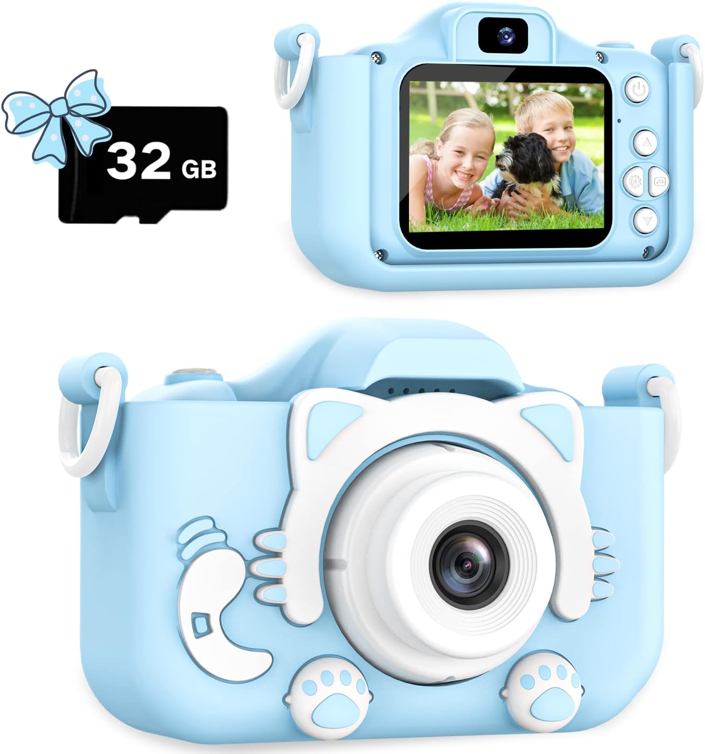 【Why choose our product】Comes with: 1x kids camera with cartoon protector, 1x exquisite packaging box, 1x USB charging cable, 1x 32GB memory card, 1x card reader, 1x hanging lanyard, 1x user manual. If you have any questions about our products or services, please contact us at any time, we will provide you with perfect solutions as soon as possible.