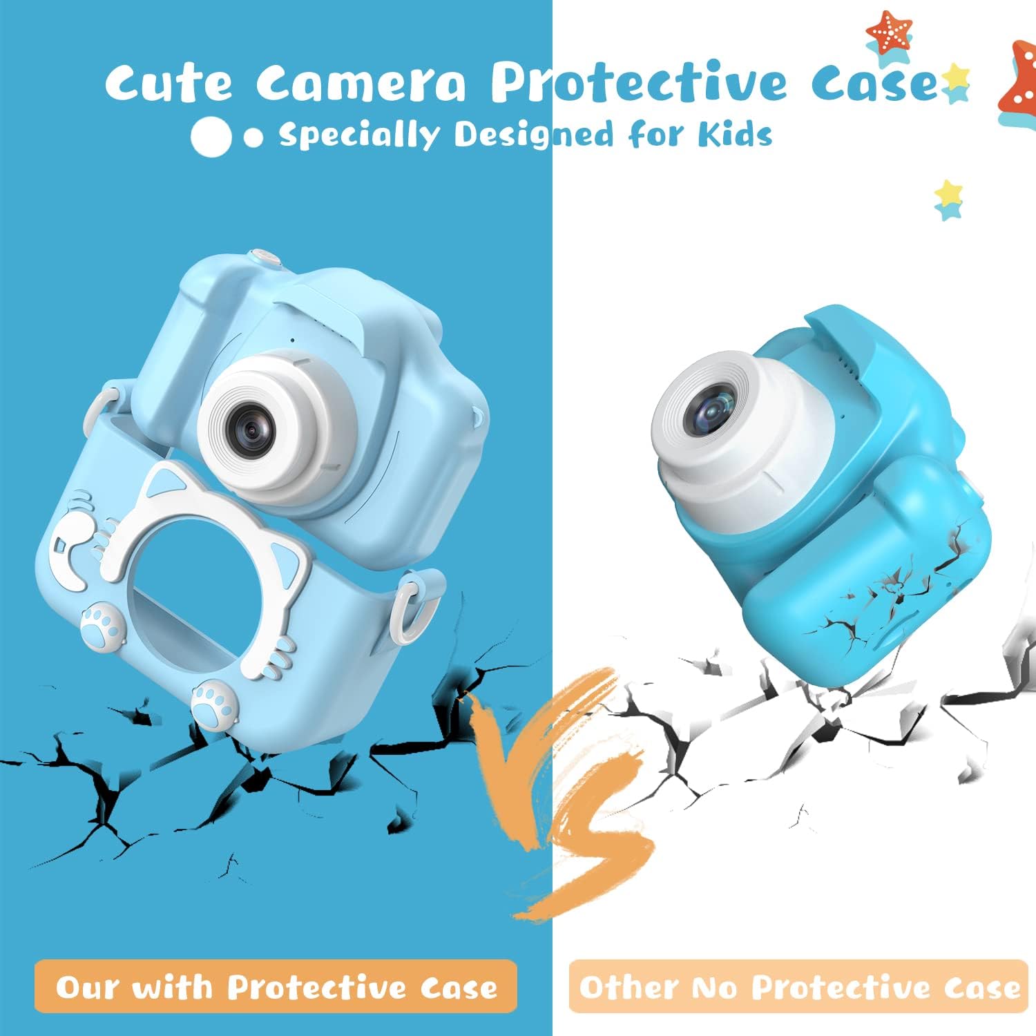 【Specially Upgraded Design for Kids】Upgraded to dual camera configuration, easy to take selfies. Just open the switch key to enjoy the fun of taking photos. Cute cartoon silicone case provides the kids camera with anti-drop design, allows kids to enjoy happy and free photography moments without worry of breakage. The kids camera is also specially designed with a durable lanyard for portability, kids can hang the camera on their neck.