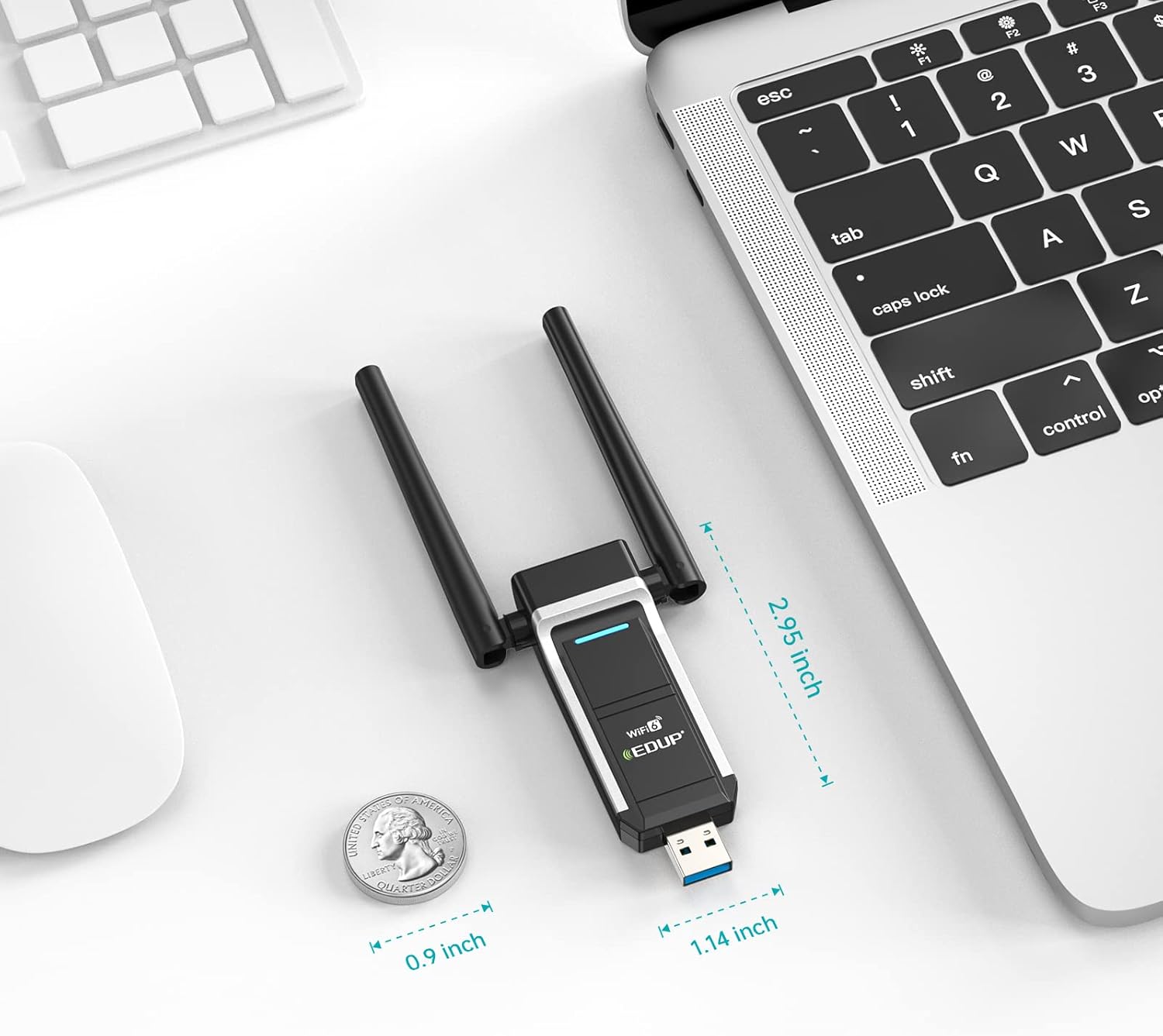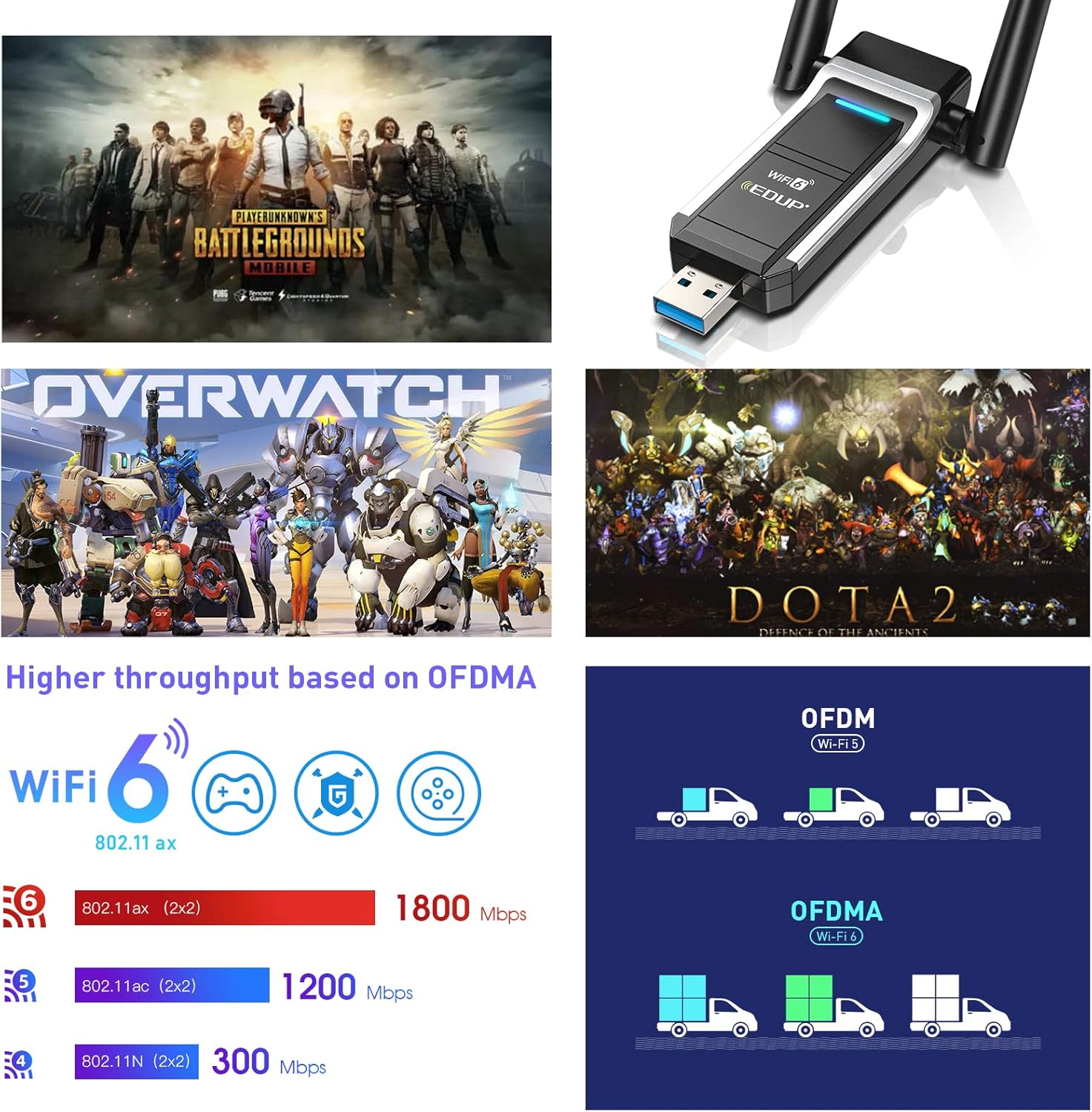 【Ultra-fast Wi-Fi 6】EDUP USB WiFi 6 adapter takes advantage of the latest 802.11ax technology, offering efficient Wi-Fi 6 connectivity for your PC. With speeds up to 1800 Mbps (1200 Mbps on 5 GHz, 574 Mbps on 2.4 GHz), it meets the demands of numerous connected devices. Keep it in your pocket wherever you go as it is compact and lightweight.