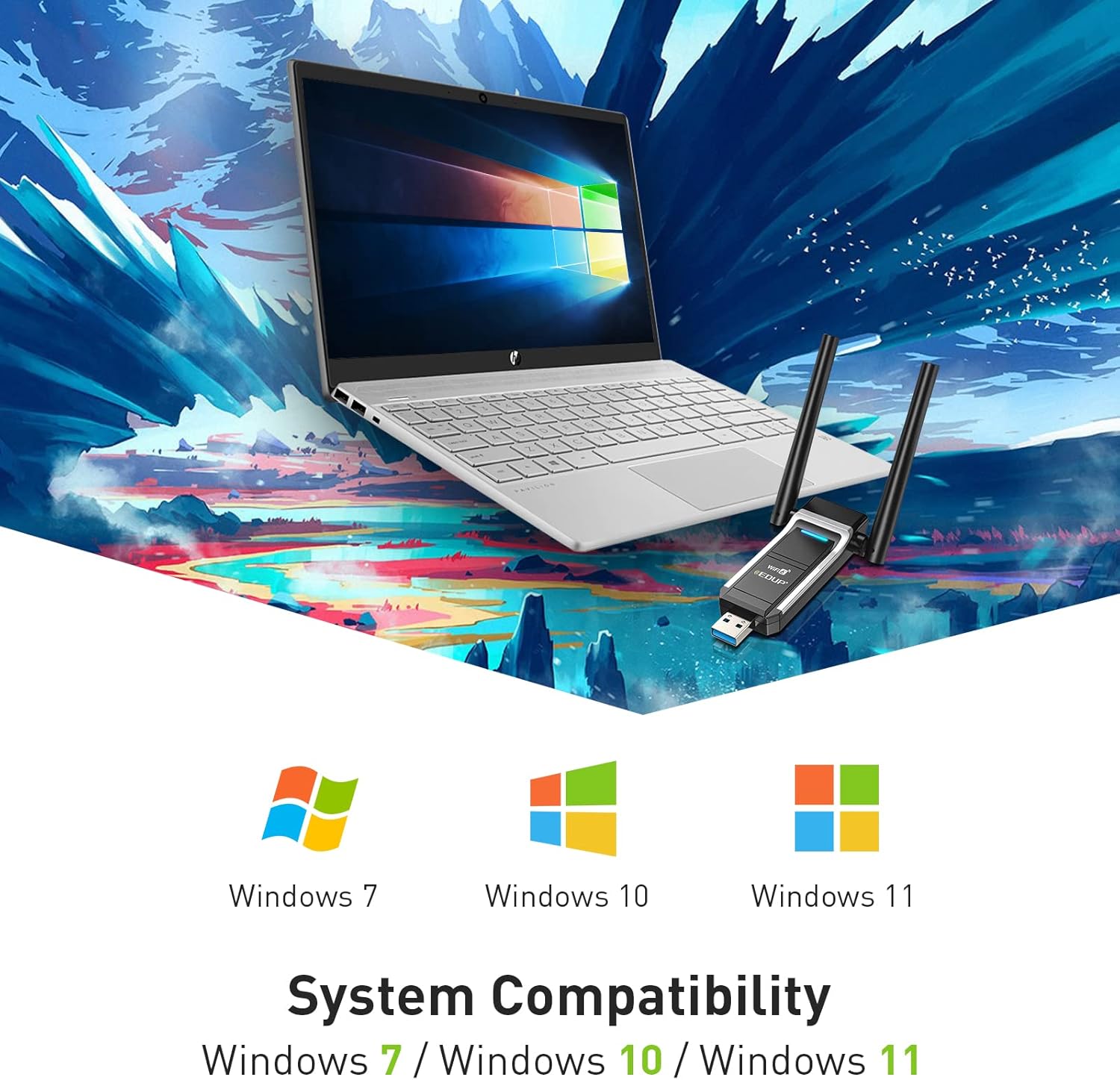 【Wide Compatibility and Dual Band Antennas】Compatible with Windows 11/10/7 (not recommended for Linux and Mac systems), the WiFi 6 USB adapter supports IEEE 802.11 ax/ac/a/b/g/n standards. Equipped with dual 5 dBi high-gain antennas, it improves signal reception and intelligently routes Wi-Fi signals to connected devices, delivering superior range and flexible connectivity.