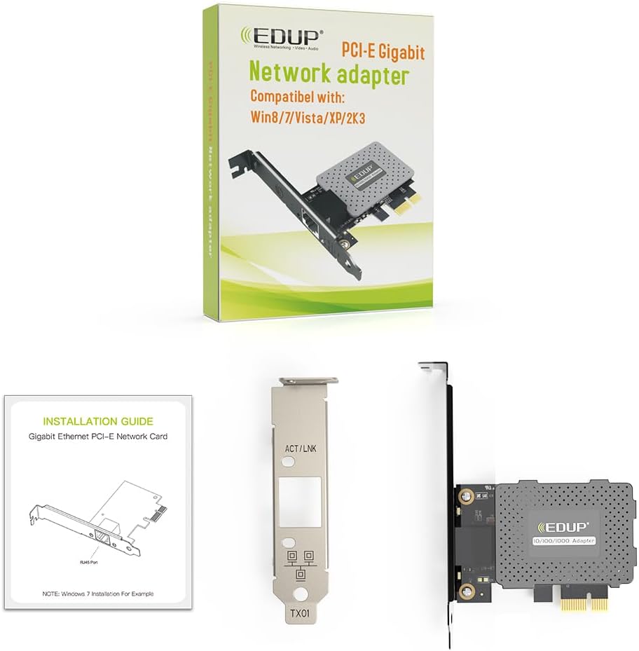 EDUP 10/100/1000 Gigabit Ethernet Netwer Adapter Card Notes 1. Power Source: (1). Only admits the 5V power supply. Do not connect the 12V power supply. (2). Do not insert the SATA power cable into our PCI-E card in the reverse direction. 2. Do not install this PCI-E card when the computer is on. 3. Download the controller before using. Controller link: / EP-9602GS-Driver / 4. Family controller Adapter of device administrator-Realtek Pcie. 5. does not support Linux or Mac OS. 6. Important note: Just work with the PCI-E slot, not for the PCI slot. The high quality PCI Gigabit NICs with a 12 cm profile support and an additional 8 cm profile support that facilitates the installation of the card in a small factor/low profile computer box. What you get: 1* EDUP Gigabit PCI-E Network 1* 8cm Low Profile Support 1* Screwdriver 1* 2* Eduup EUPUs 2-year-old network without problems and friendly customer service for life.