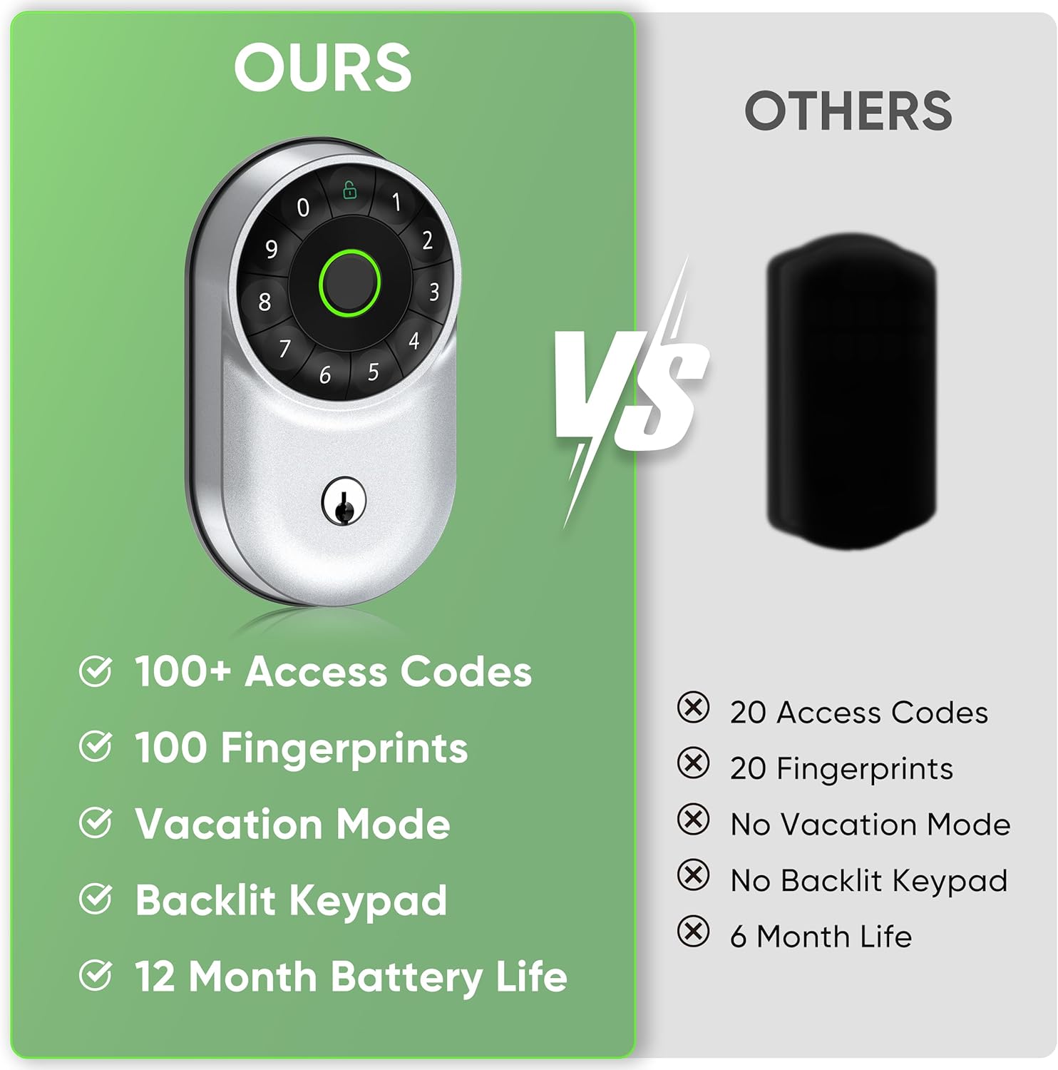 Codes Up to 100 codes 20 codes Fingerprints Up to 100 fingerprints 20 fingerprints Vacation mode Support Not supported Backlit keyboard Support Not supported Battery life 12 months 6 months