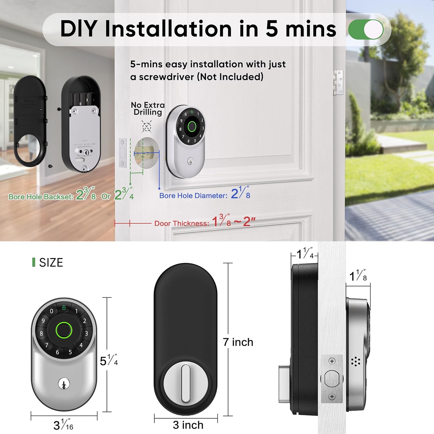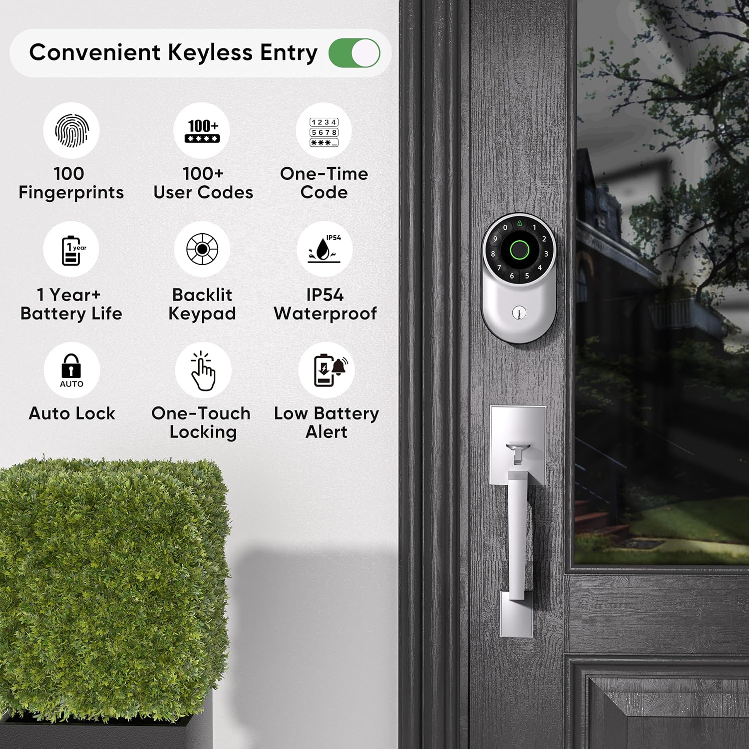 Convenient Keyless Entry: Supports storage of up to 100 fingerprints and 100 user codes; Up to 1-year battery life with low battery alert; Upgraded backlit keypad with IP54 water-resistant rating; Customizable auto-locking door upon exit; One-touch keypad locking from outside; Includes 2 keys for keyless unlocking.