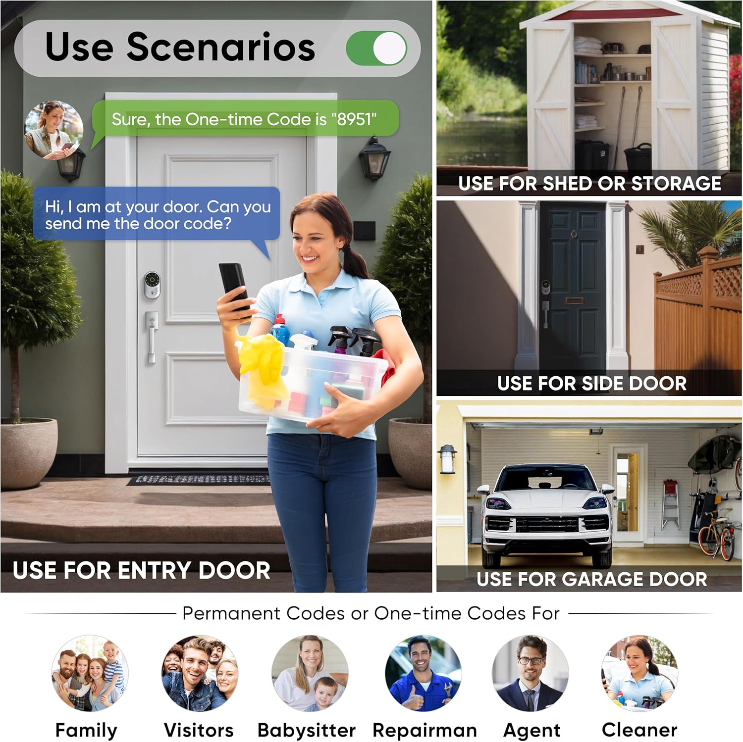 Usage Scenarios: Suitable for entry doors, side doors, sheds, storage doors, garage doors and more. Easily share permanent or one-time codes with your family, visitors, babysitter, repairman, real estate agent or cleaning staff.