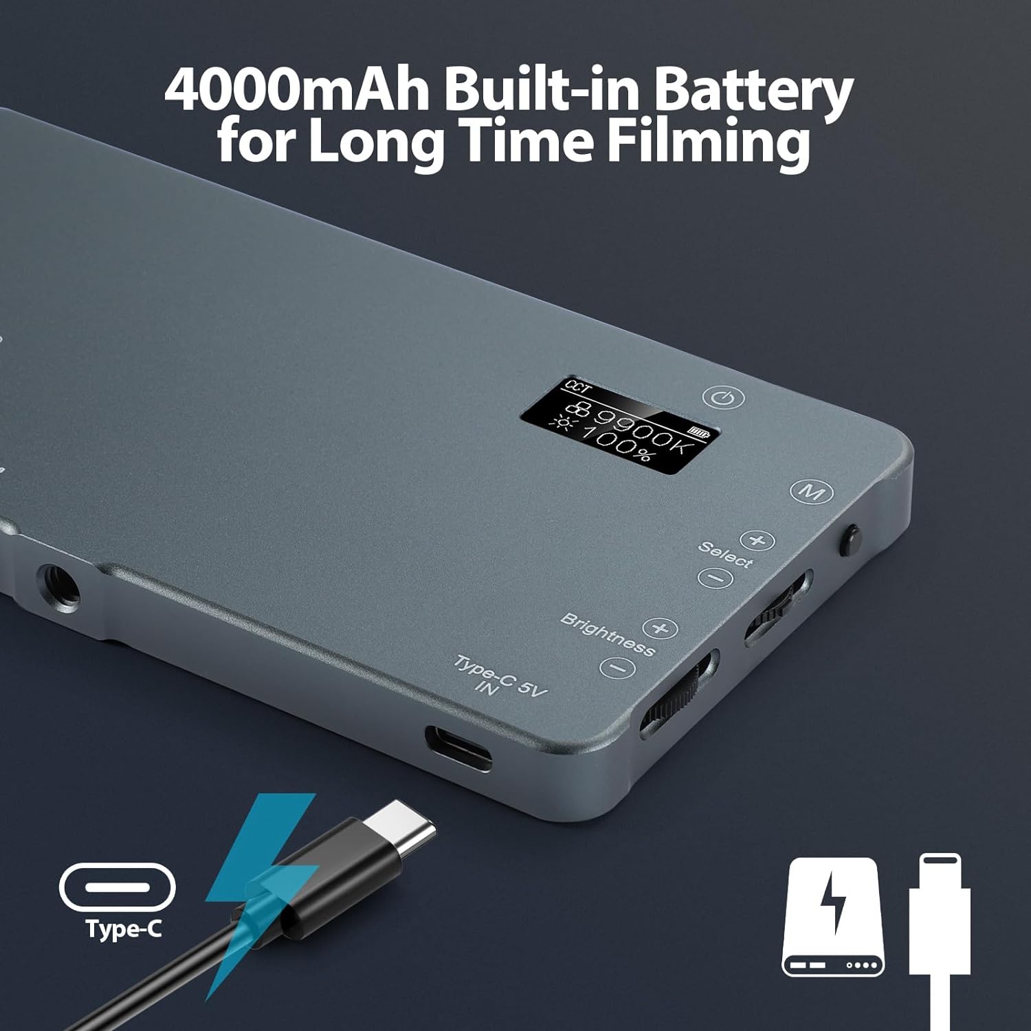 【Long lasting】With built-in 4000mAh high-capacity rechargeable lithium polymer battery, which allows a duration of 20 hours. It is more powerful than other batteries, allowing you to shoot outdoors and indoors for a long time. It has USB-C and Micro USB charging ports and the video light can be charged by wall charger, power bank or car charger, etc. It is truly a must-have accessory for photographers and ideal for your travel vlogs.