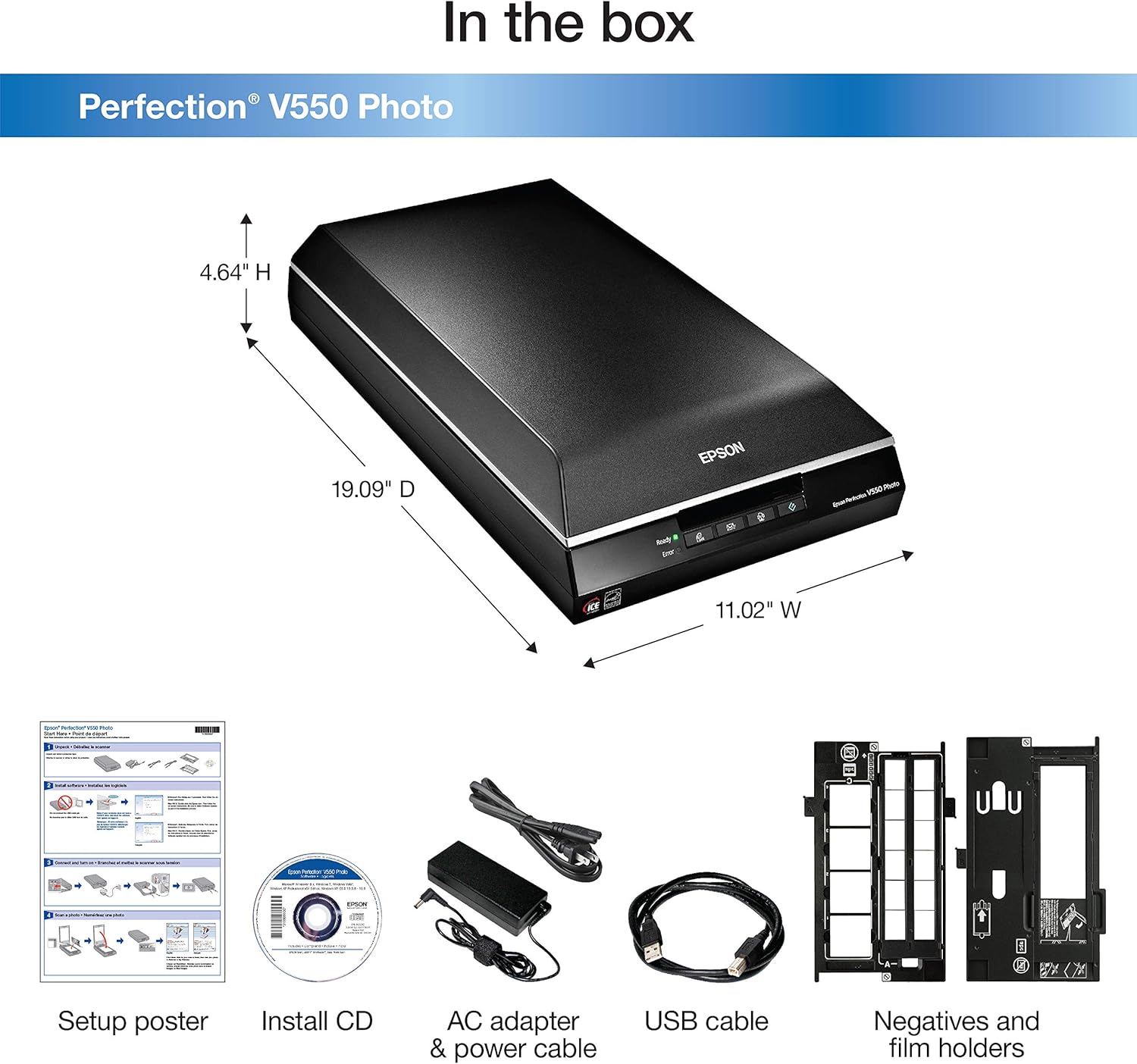 The Epson Perfection V550 Photo features amazing performance and versatility for any project. 6400 dpi (1) optical resolution ensures images are sharp and vivid, whether you're scanning film, slides, negatives, or everyday documents. Plus, with the touch of a button, you can make your old photographs and negatives look new with Easy Photo Fix and Digital ICE. The V550 Photo features energy-efficient ReadyScan LED technology for high-speed scanning with no warm-up time. Plus, you can scan multiple slides, film strips, and photographs all at once. The V550 Photo is the ultimate productivity tool.