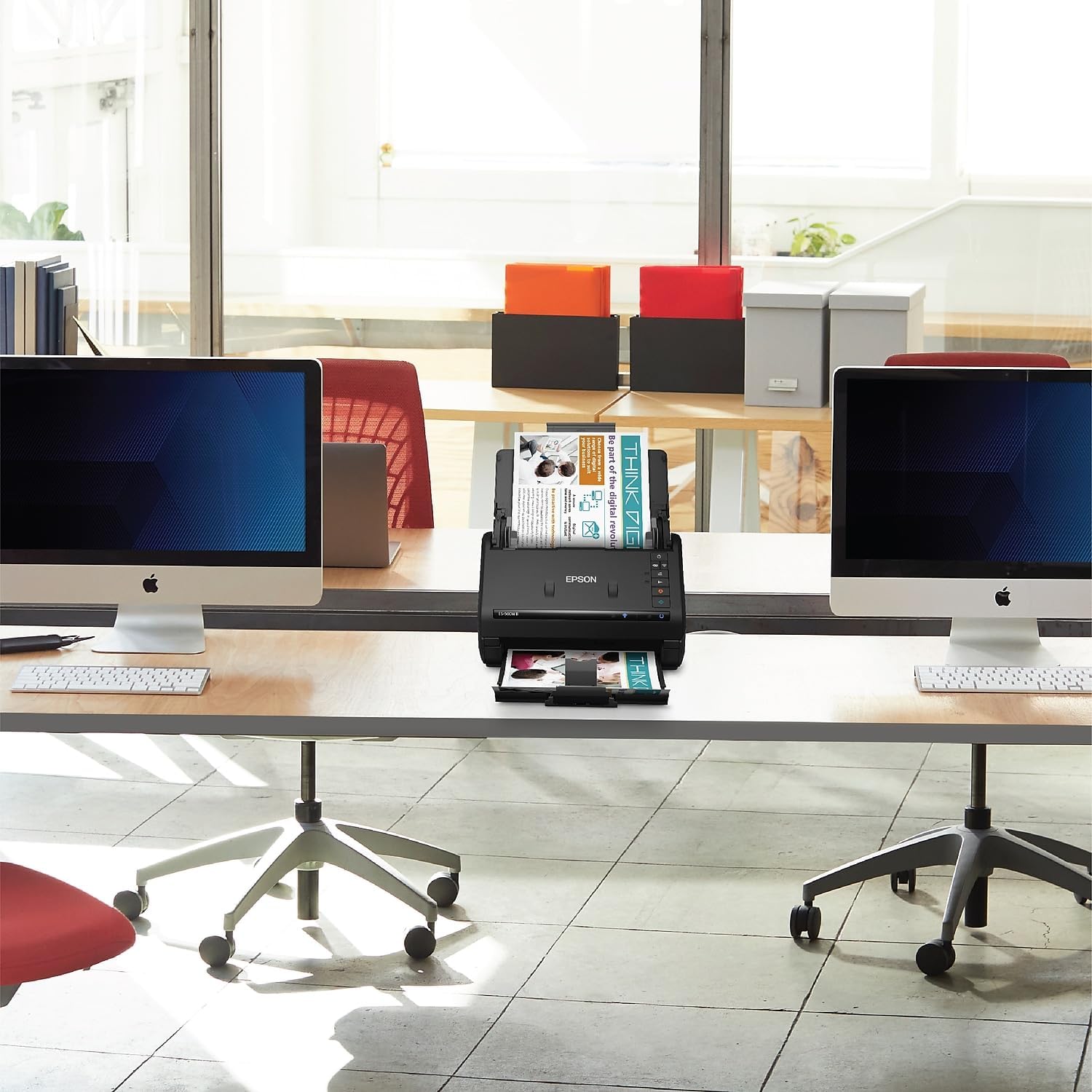 Get organized quickly with the WorkForce ES-500W II wireless duplex desktop document scanner. This reliable, easy-to-use interpreter speeds scans up to 35 ppm/70 ipm (1), capturing both sides of each sheet in a single pass. Its 50-sheet automatic document feeder allows you to quickly review stacks of documents of different sizes. Intuitive Epson ScanSmart software (2) means you can easily preview, email and upload your scans. The included TWAIN driver ensures compatibility with most document management software. Scan wirelessly to cloud storage accounts (2) and create searchable PDF files. You can also scan directly from your mobile device using the Epson Smart Panel app (3). Image and color adjustment features such as auto cropping, staple protection, dirt detection, and paper skew correction help ensure outstanding image quality.