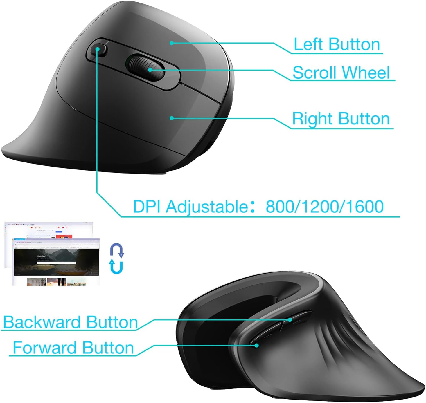 【Designed for a lot of time use】 This ergonomic wireless mouse has more buttons than a traditional mouse. Not only can you help you adjust the DPI of your ergonomic vertical mouse, but the two buttons on the side also allow you to navigate the web pages and the documents faster.