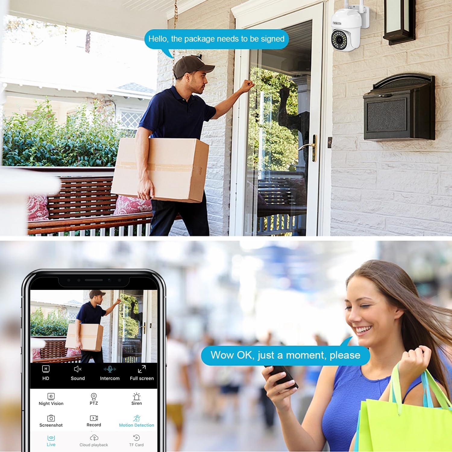 ☆Compatible With Alexa For Voice Control, Two-Way Audio & Sound Alarm, Built-in microphone and speaker, you can have a conversation between you and your visitor, you can also create a sound alarm to scare away the invader via the speaker.
