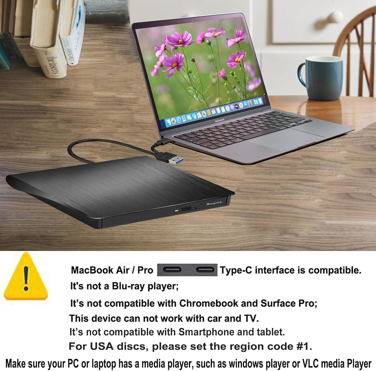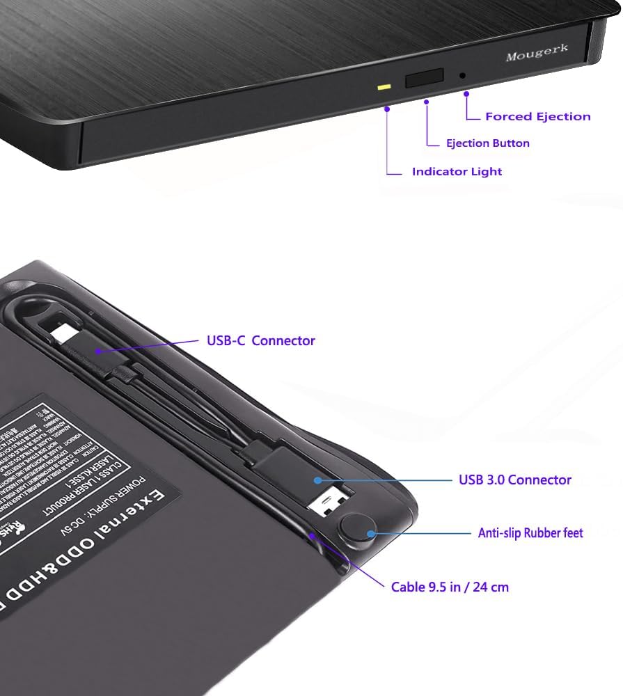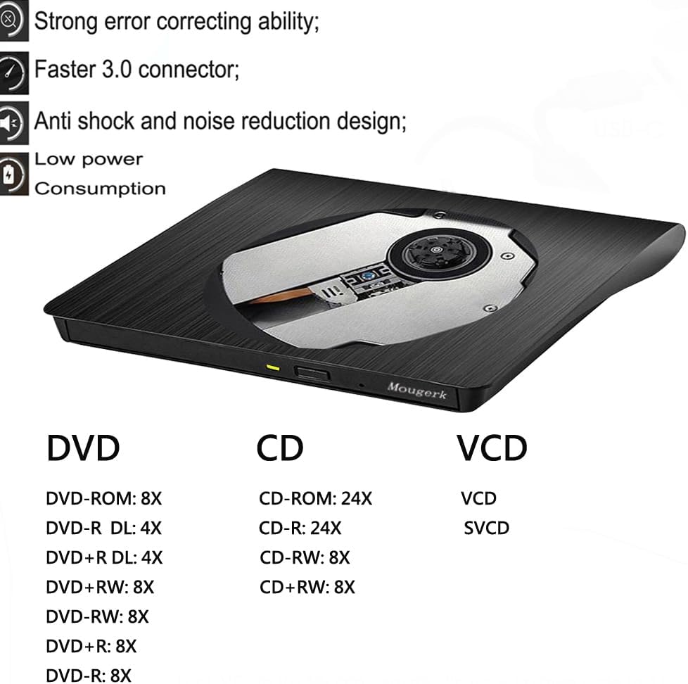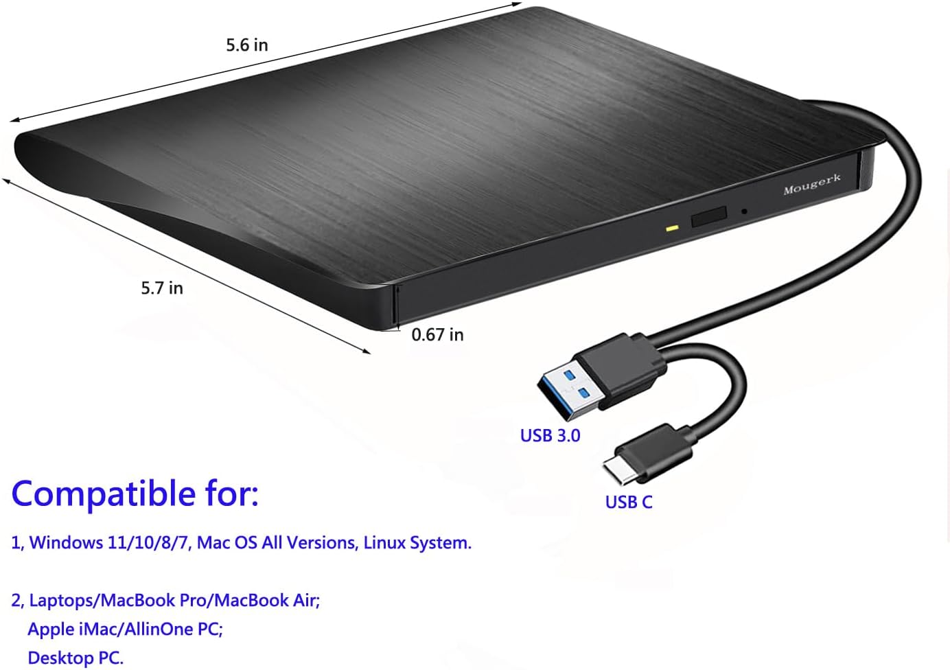Mougerk provides fast, portable and slim USB3.0 CD/DVD burner, you can watch DVD movies, burn files, movies to CD/DVD, install software and create backup discs, etc. Compatible with Windows 10/8/7/XP, Linux, Mac10 system and operating system.