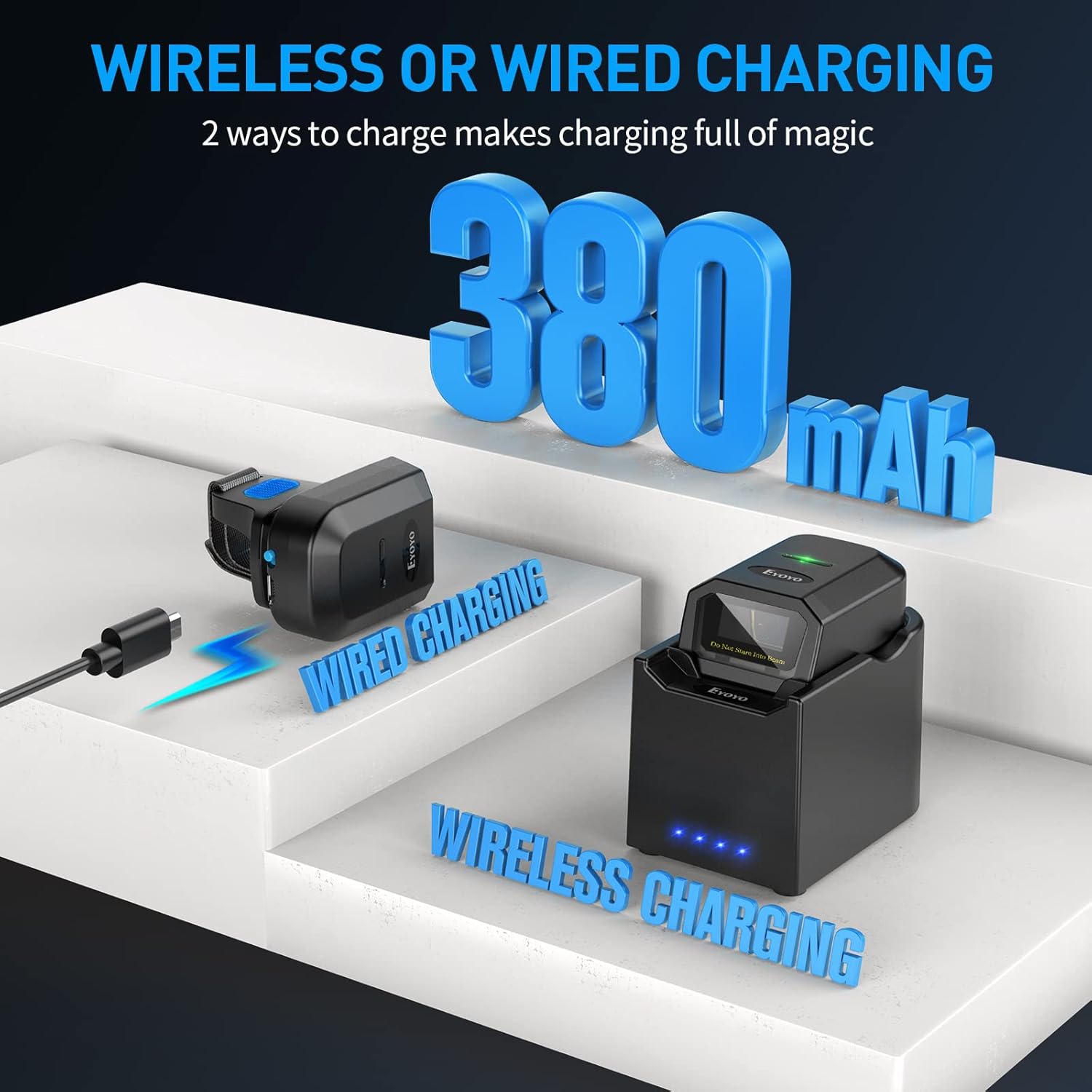 Wireless load base: It has the Eyyo versatile load base, no more worried about being able. Load your ring scanner at any time you need, or simply use it as a general storage dock. Unlike the general storage springs, this large -capacity battery battery, which can load its finger scan 3 times when it is completely loaded
