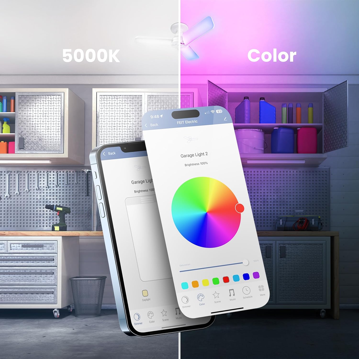 ✅ SET YOUR ROUTINE: Set up entire rooms, single groups, or schedules to turn your garage smart bulbs on/off at a specific time using the Feit Electric app. Use the scenes feature to save color settings unique to your shed or workbench.
