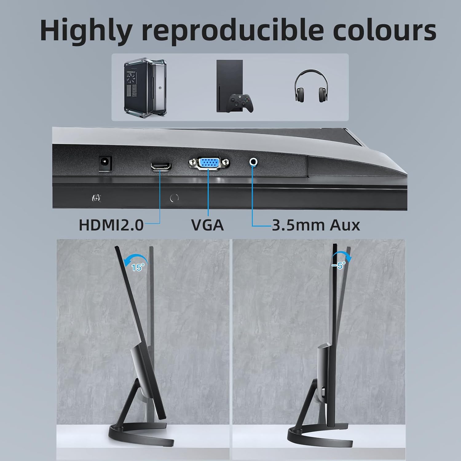 [Optimized Ergonomic Design] Jlink computer monitor, with professional ergonomic design and stepless tilt adjustment (5° forward, 15° backward), fits your ideal viewing position. The computer screen with detachable stand can also be mounted on the wall, making the monitor more flexible for watching and gaming. The unique slider allows one-click manipulation of the entire OSD menu while making the experience more comfortable.