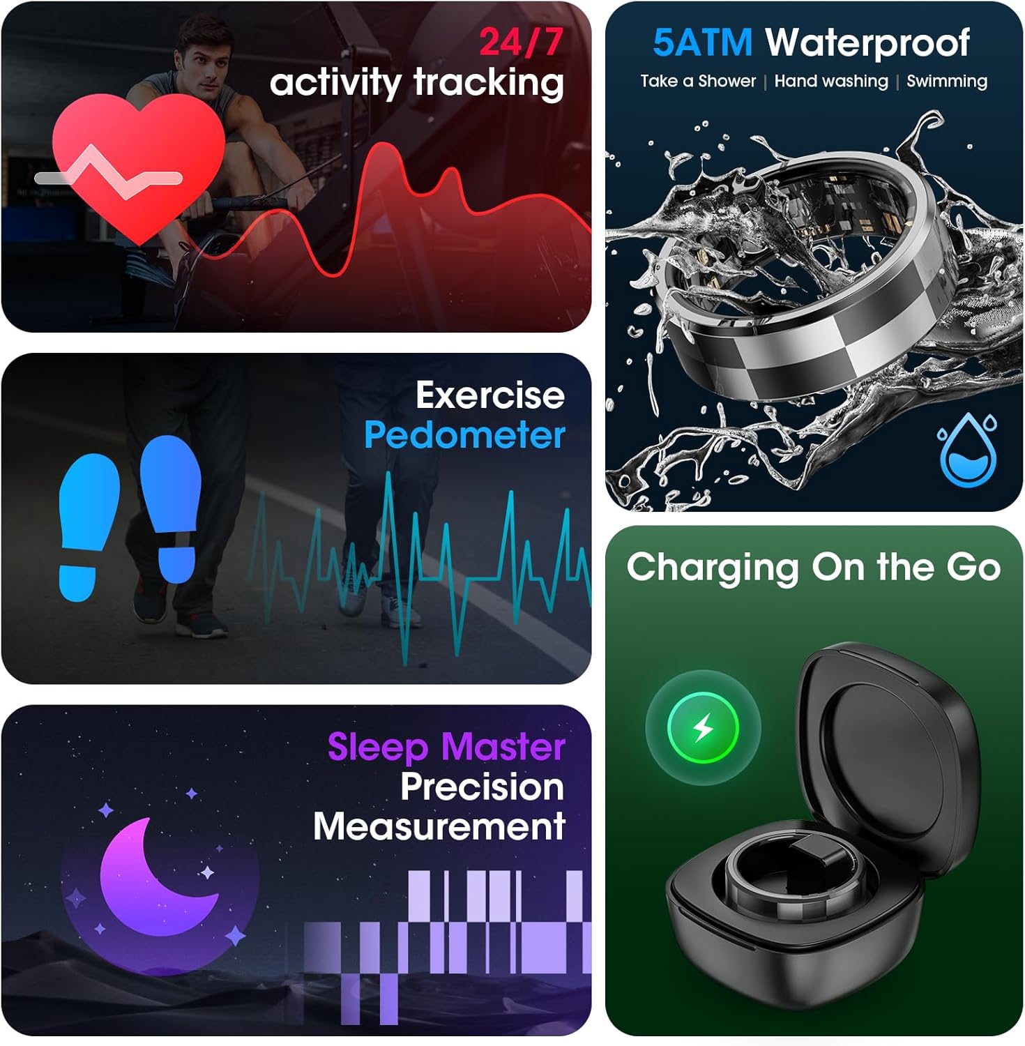 【Easy loading and waterproof design】 Our smart ring has a magnetic load cable and comes with a mini additional load case, which offers a convenient storage solution while allowing a quick recharge. A single 30 -minute charge provides 5 to 7 days of continuous use. In addition, with an impressive waterproof rating of 5ATM, you can use it with confidence while showers or swimming in the pool.