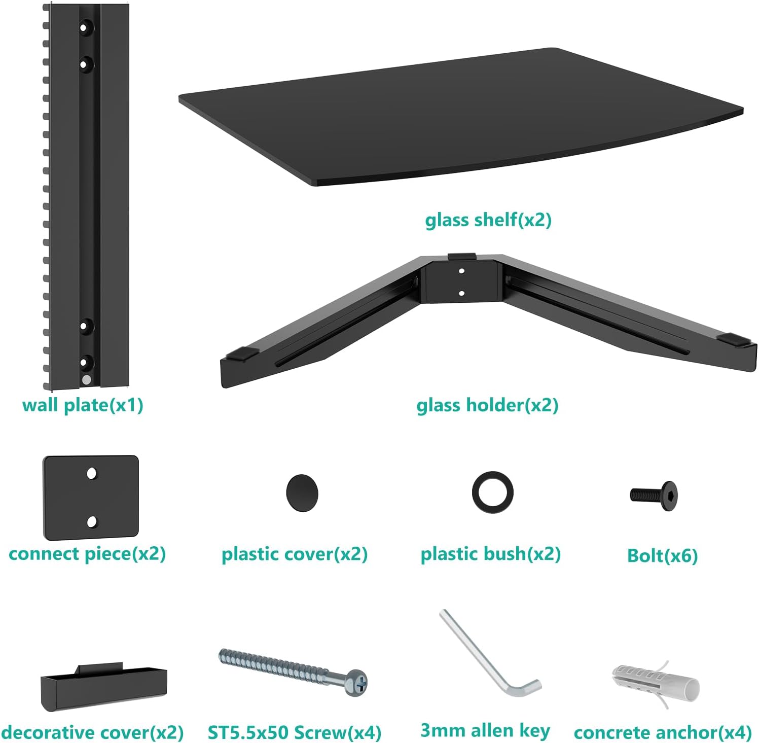 Package Includes: 1 x WALI Floating Shelf System (Black), 2 x Reinforced Tempered Glass, Mounting Hardware Kit, User Manual, Experienced and friendly US-based customer support available to help 7 days of the week.