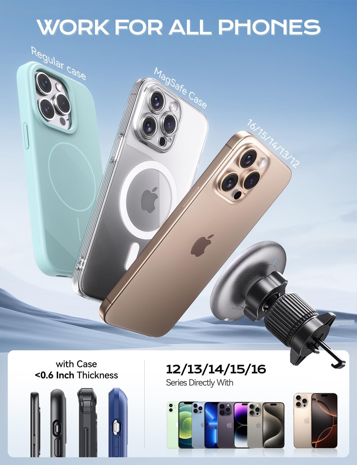Universal Compatibility with Phones and Cases: No need to remove your phone case. This car phone mount works effortlessly through Magsafe cases, offering convenience without sacrificing protection. (For non-magnetic cases or phones without Magsafe functionality, you can use the included magnetic ring)