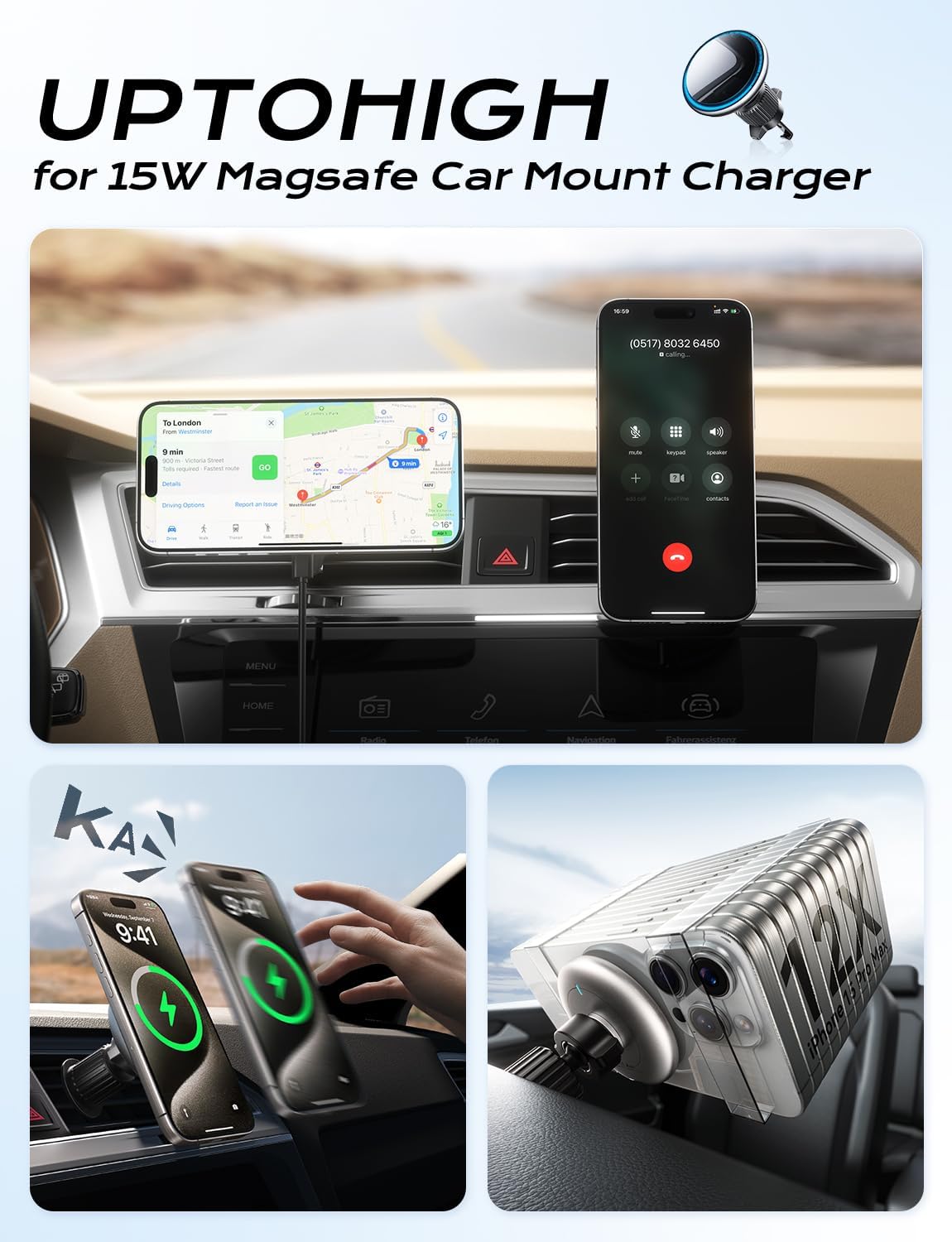 Premium & Secure Mounting Clip: Made of high quality PP material and equipped with a heat sink for durability, this magnetic car phone holder stays solid. The ultra-durable vent clip keeps the Magsafe car charger securely mounted even on rough roads, ensuring consistent performance.