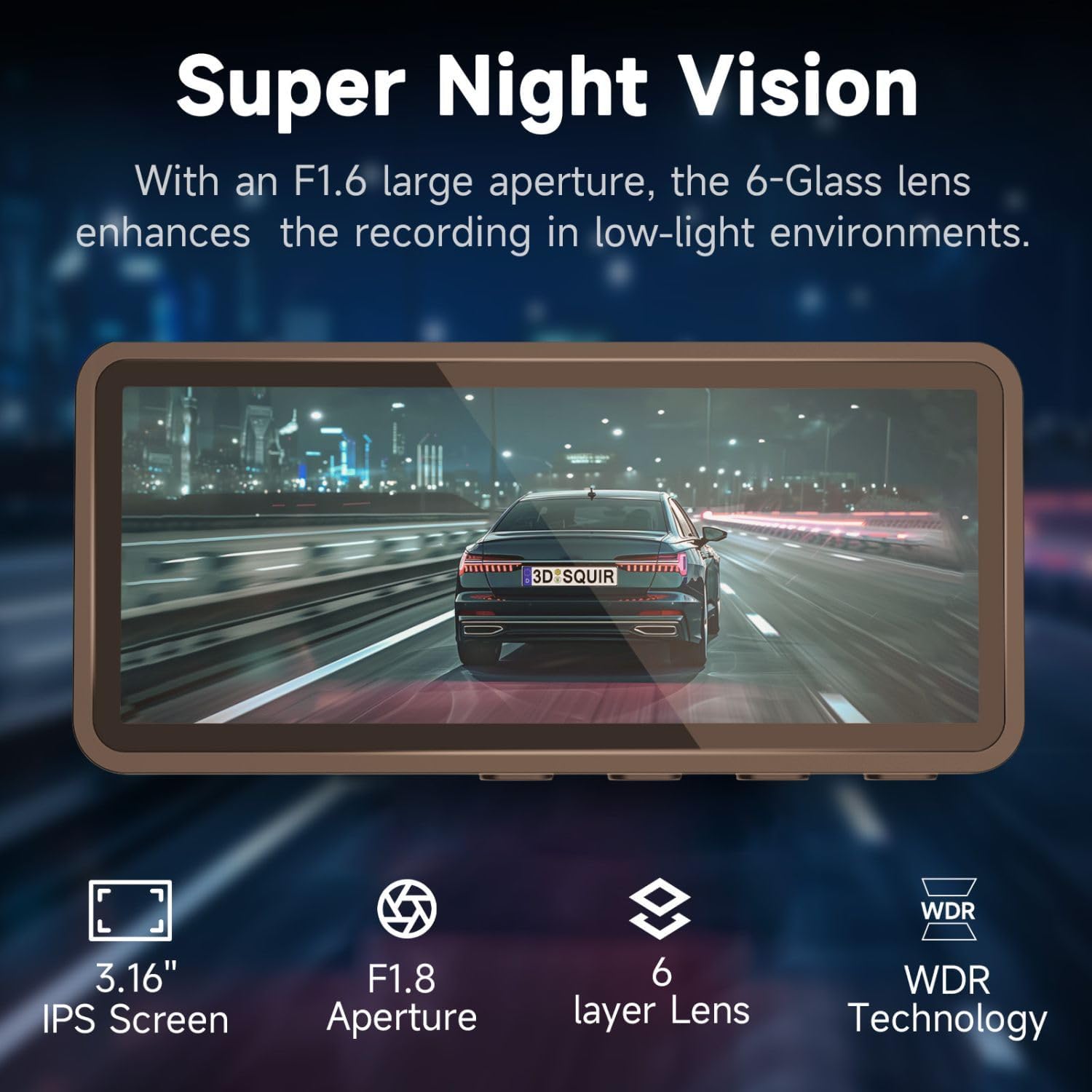 Super Night Vision & WDR Technology: Ecomoment Dash Cam adopts F1.8 ultra-large aperture and 6-layer lens which increases light intake by 60%, and is equipped with WDR (Wide Dynamic Range) technology, achieving super night vision by automatically balancing exposure in extremely dark scenarios, to ensure clear and sharp images.