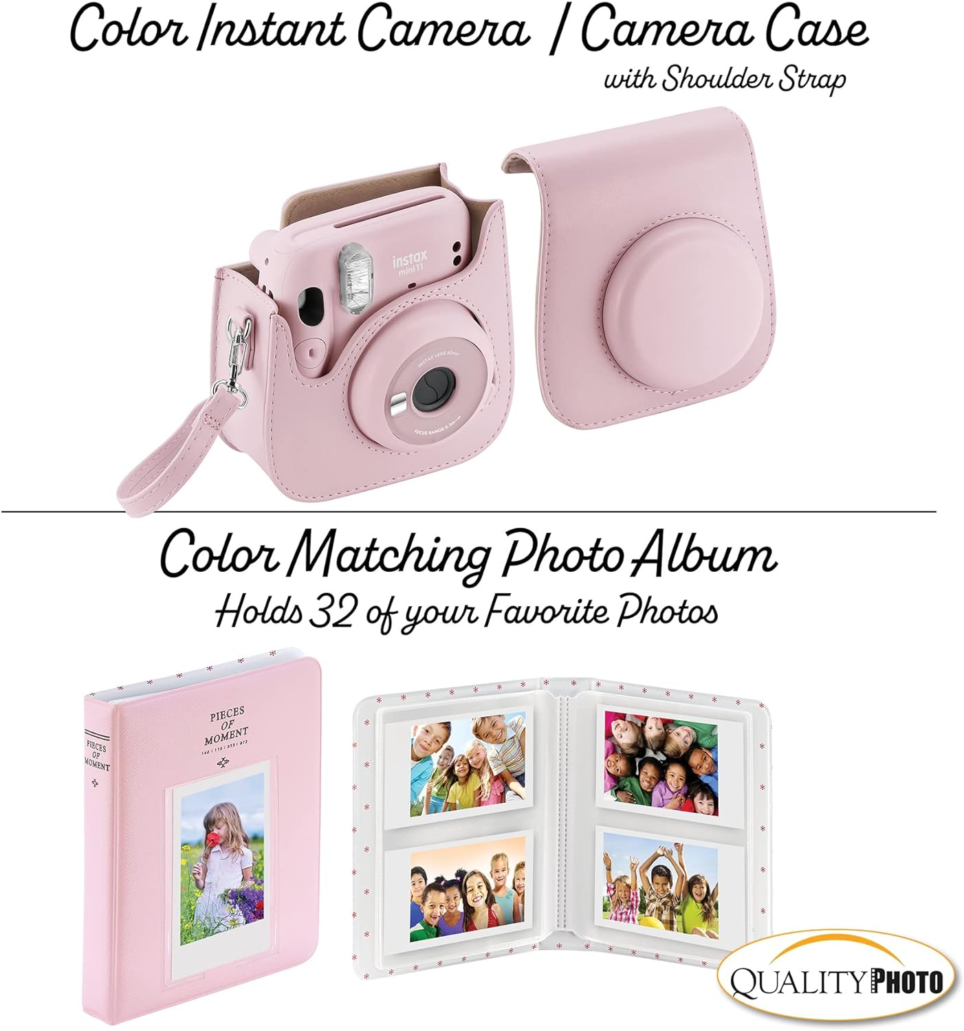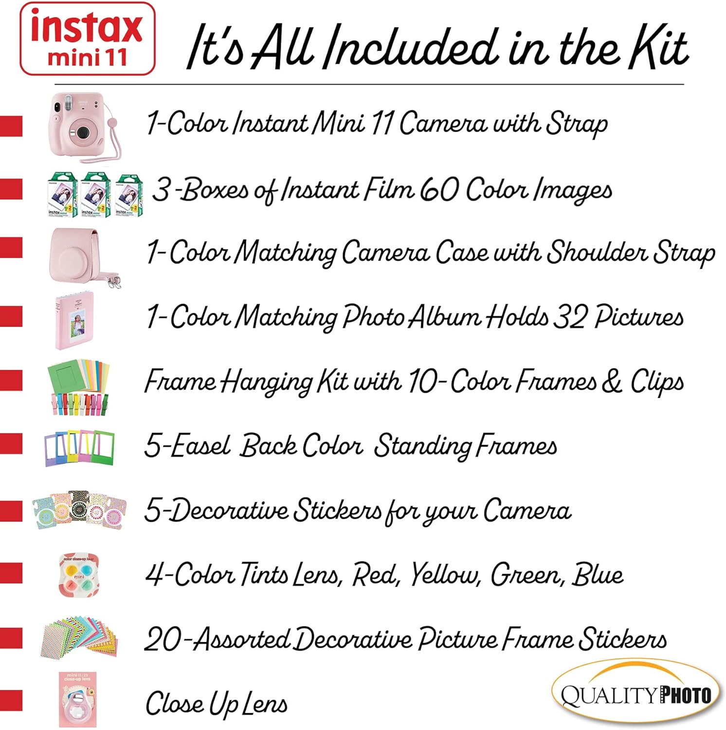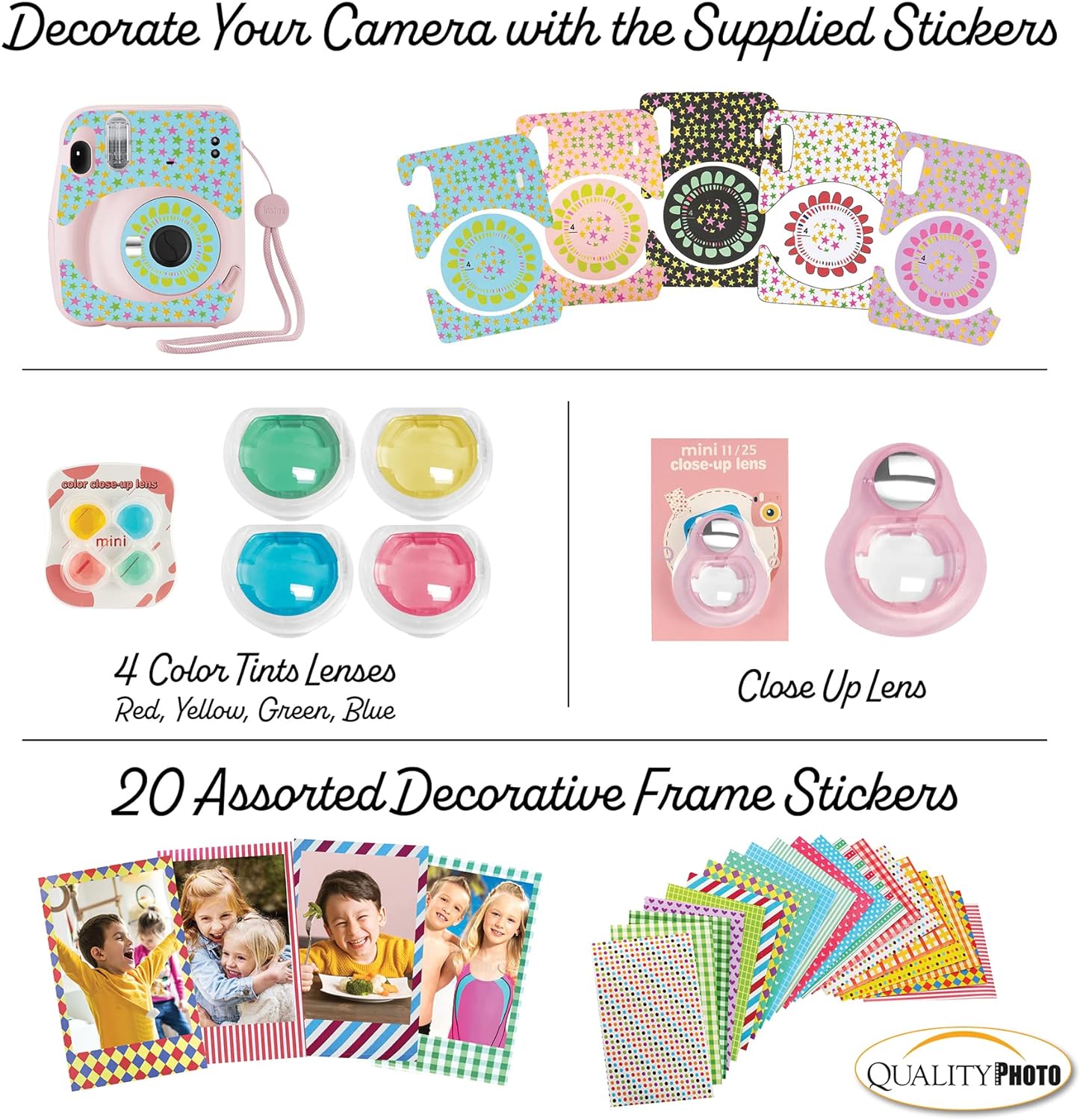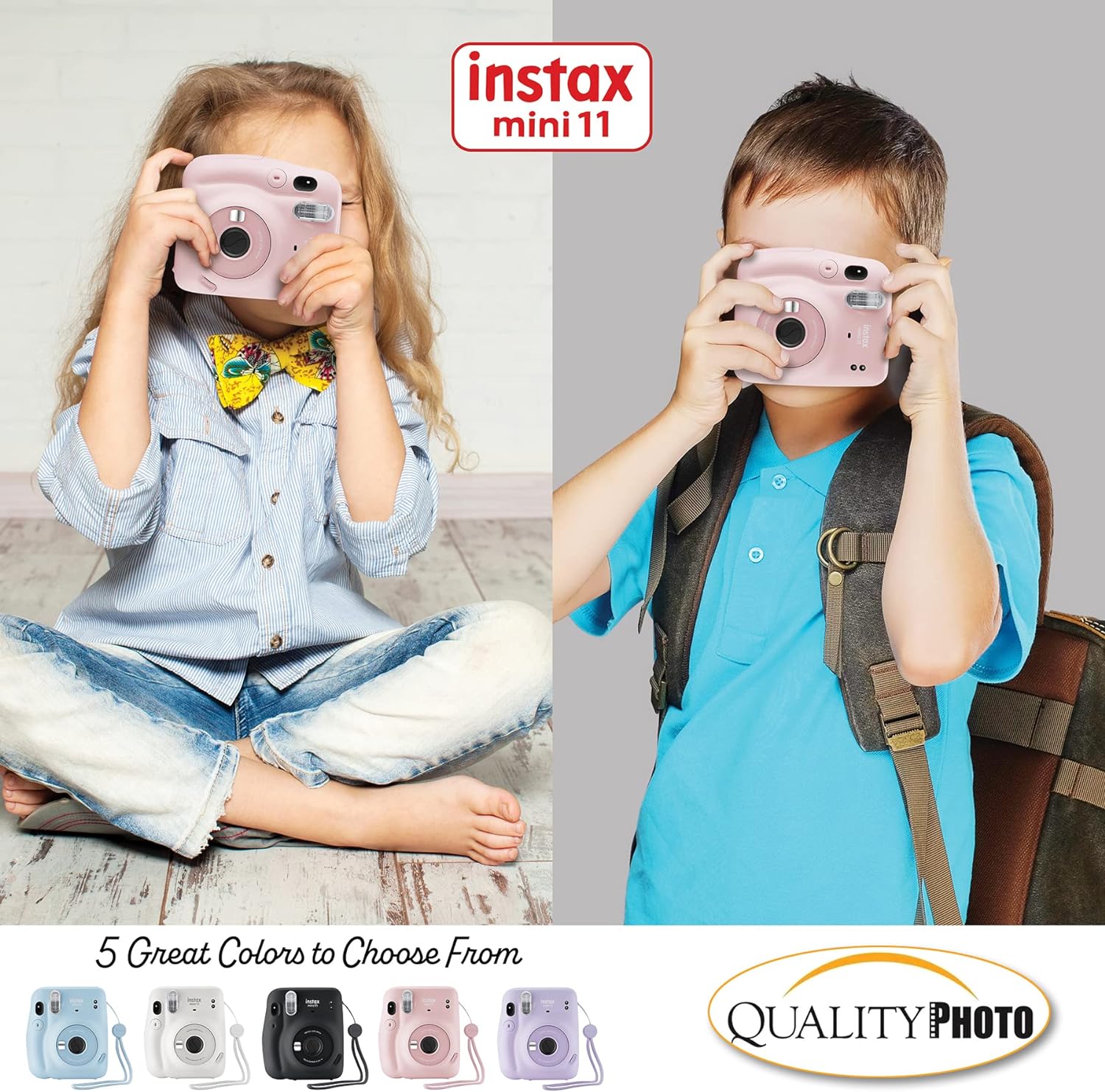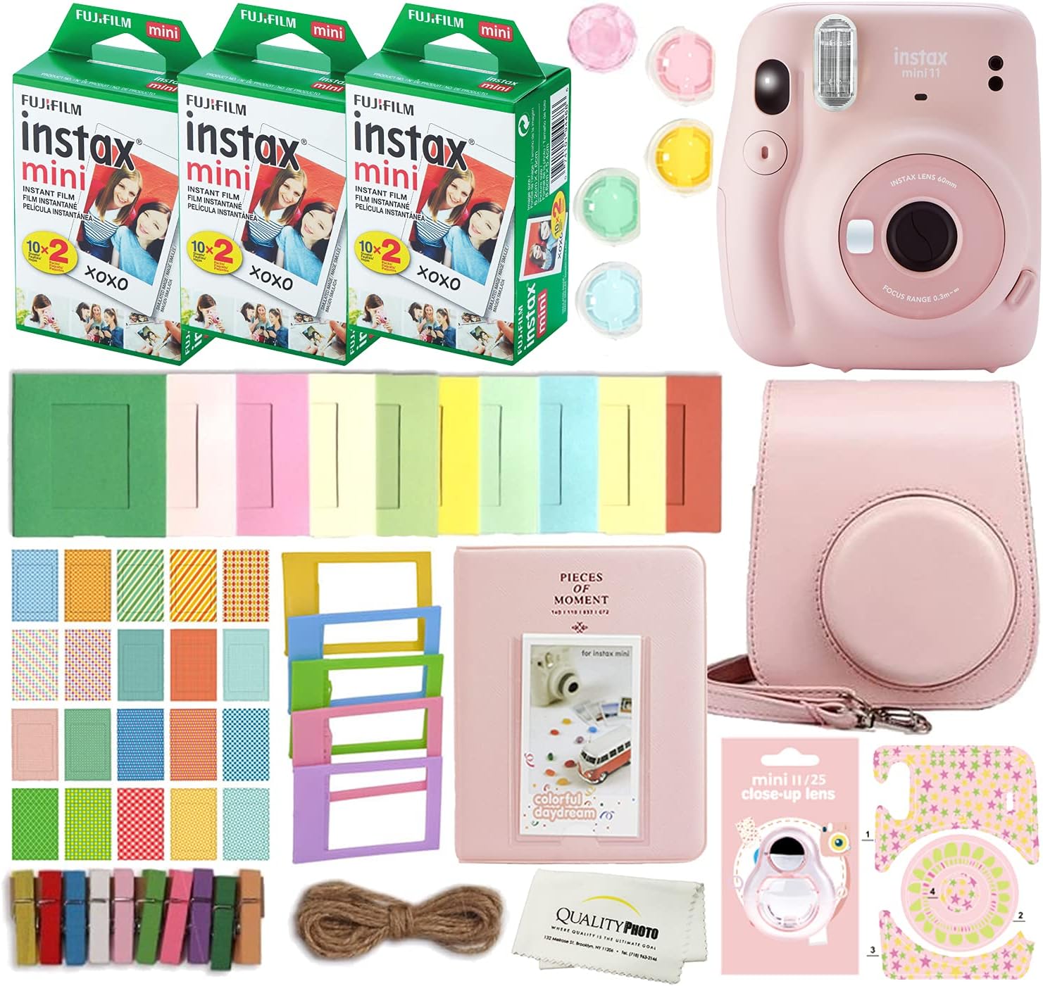 Value accessory package. Includes the famous Fujifilm Instax Mini 11 camera (color of your choice) with a matching camera case to keep your camera protected. 60 Fujifilm Instax films so you can use your new camera right away! Perfect size photo album for instant prints. Many more accessories, including frames to hang and decorate your photos, stickers, colored lenses for close-ups, and camera stickers to add color.