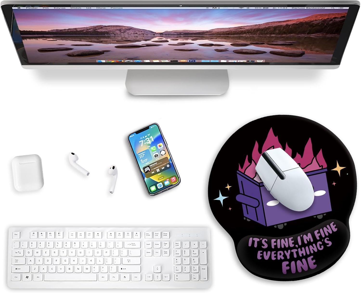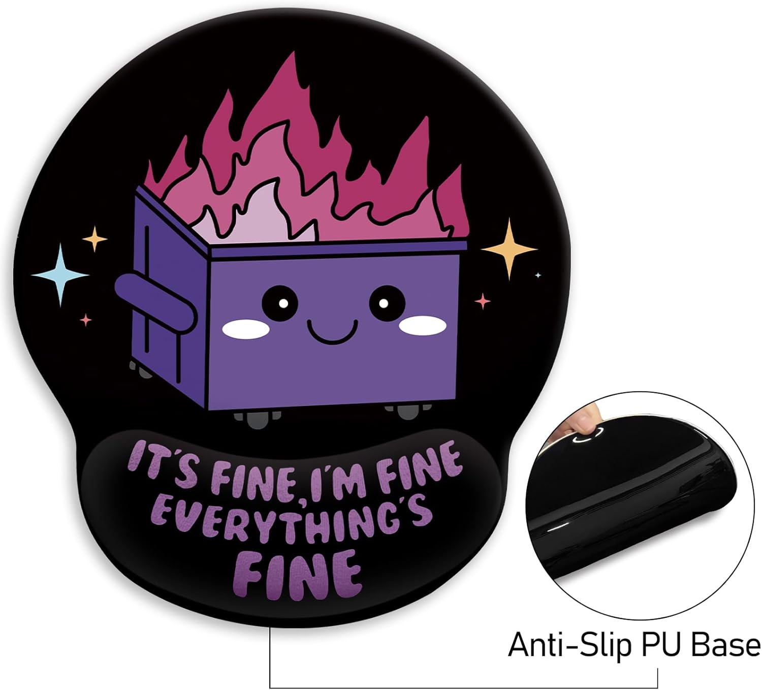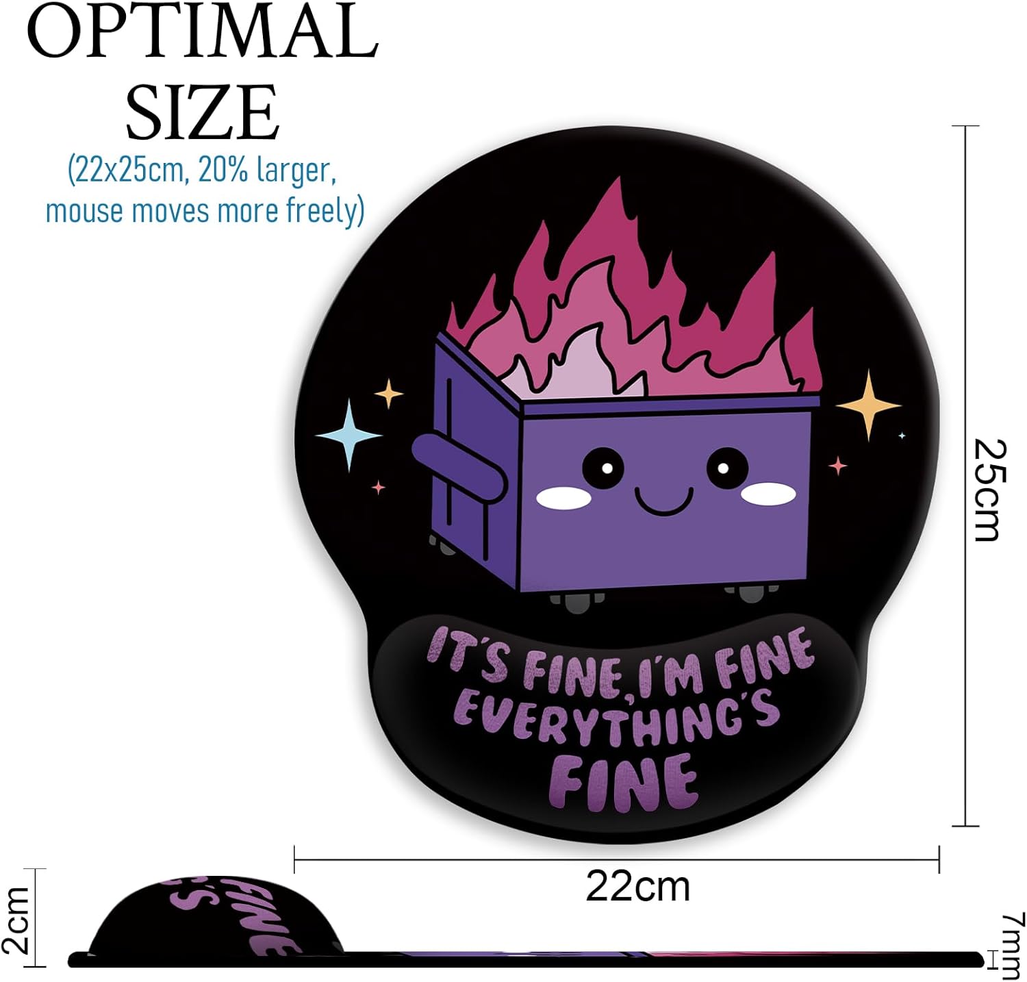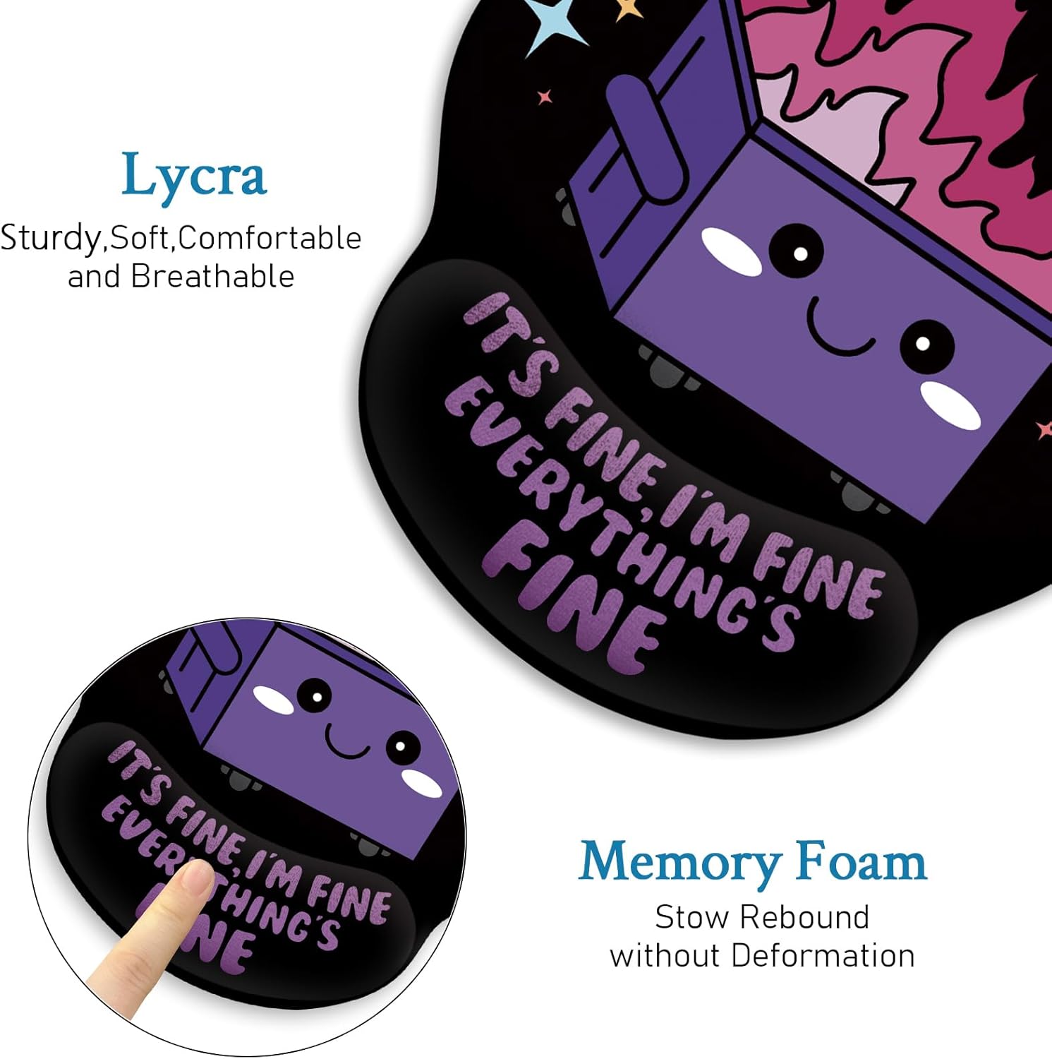 Novel design: The mouse pad with doll support has clear patterns and unique styles, which design with an elegant impression: okay, I'm fine, everything is fine. Mouse Pads for Desk is an excellent office desktop accessory and a good partner to learn, work and play games. Add more personality to your office
