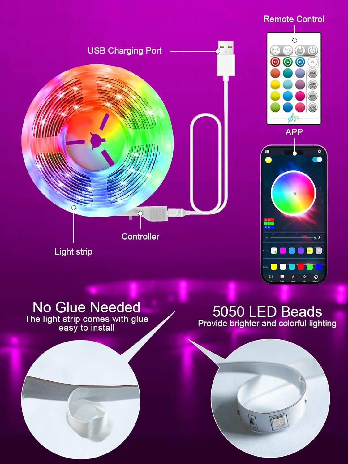 Remote Control: 24-key remote control can get 16 static colors and 4 dynamic modes, 10 brightness adjustments. It is easy to control the strips easily anywhere in your home.