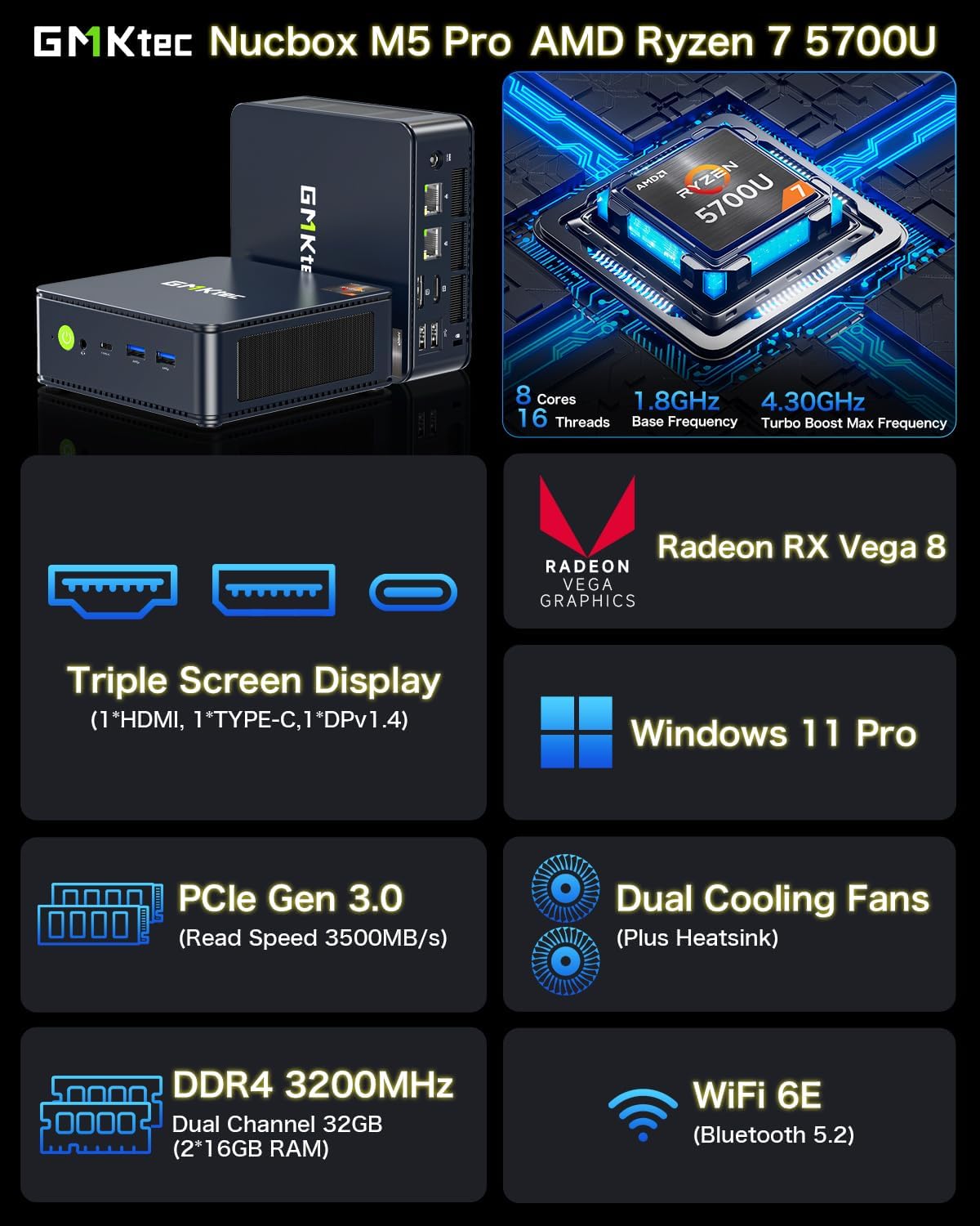 【Office Gaming Mini PC】GMKtec Nucbox M5 Pro series is equipped with the powerful AMD Ryzen 7 5700U processor, 8 cores/16 threads, boosted up to 4.30 GHz, based on ZEN 2+ architecture, pre-installed with Windows 11 pro, this small but powerful mini PC delivers satisfactory results in productivity, office work and gaming. 30% performance increase over previous AMD Ryzen 5 5600U 5560U 5500U.