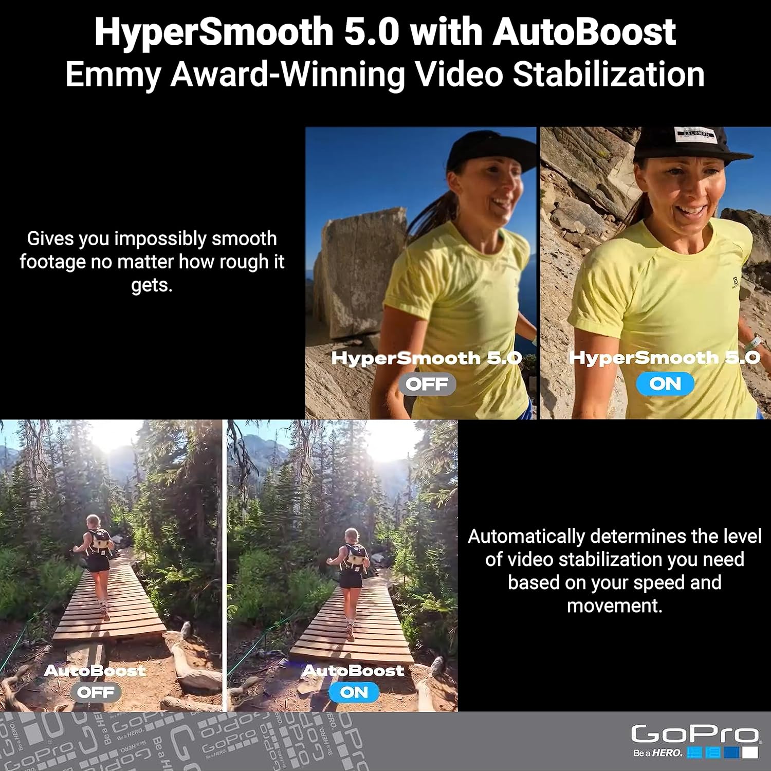 Emmy Award-Winning HyperSmooth Stabilization: HyperSmooth has never been better, winning an Emmy in 2021 for its in-camera sensor and software stabilization. HyperSmooth 5.0 raises the bar with improved Horizon Lock stabilization for 4:3 aspect ratio footage thanks to our new image sensor and AutoBoost for maximum stabilization with minimal image cropping.