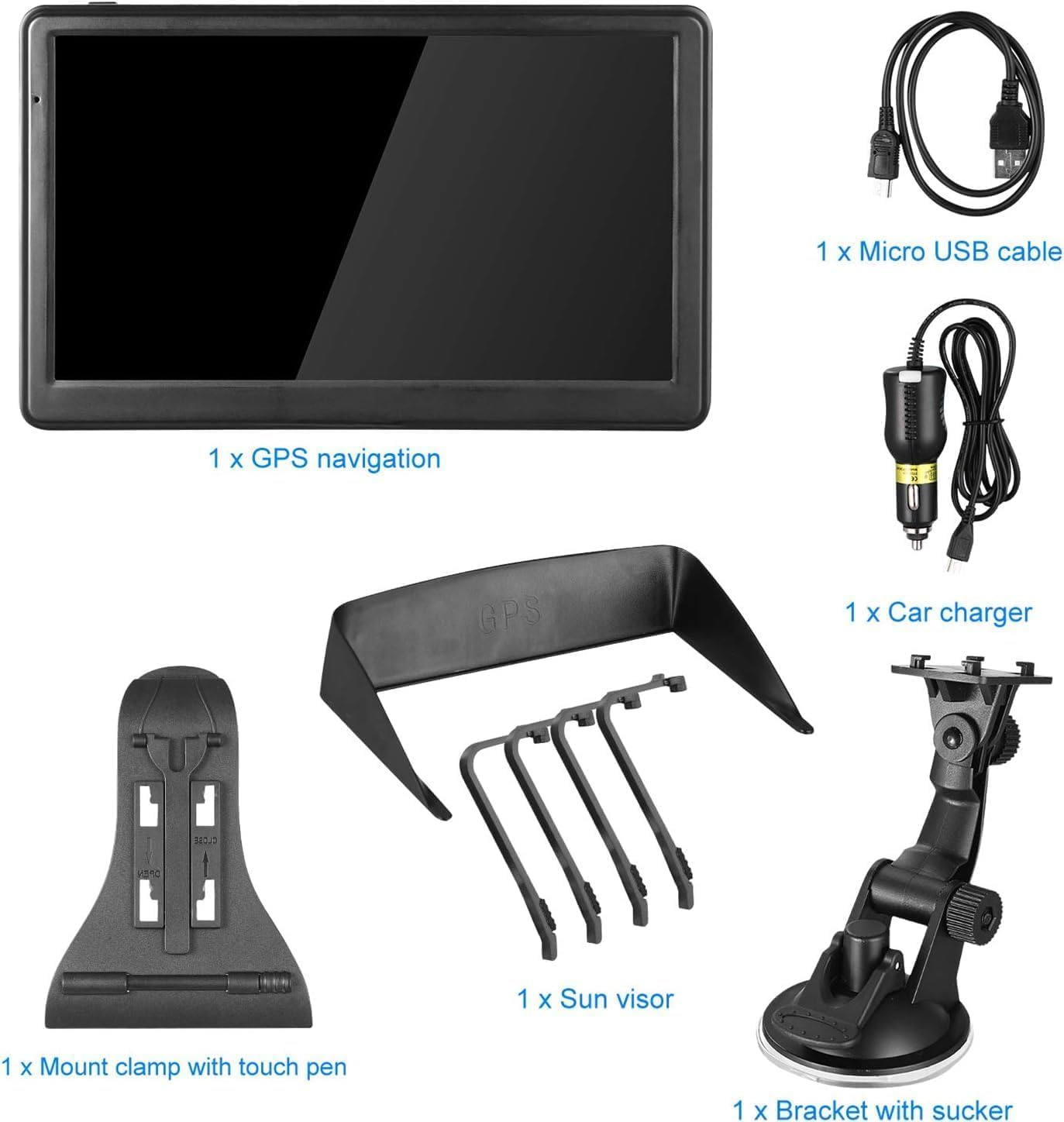 【What you get】 ①GPS navigation with CE and RoHs certificate ②Car charger ③USB Cable ④Suction cup holder ⑤Rear holder ⑥User manual. (Common questions and operations are in the user manual, please read it carefully before or while using navigation. If you need more help, please feel free to contact us.)