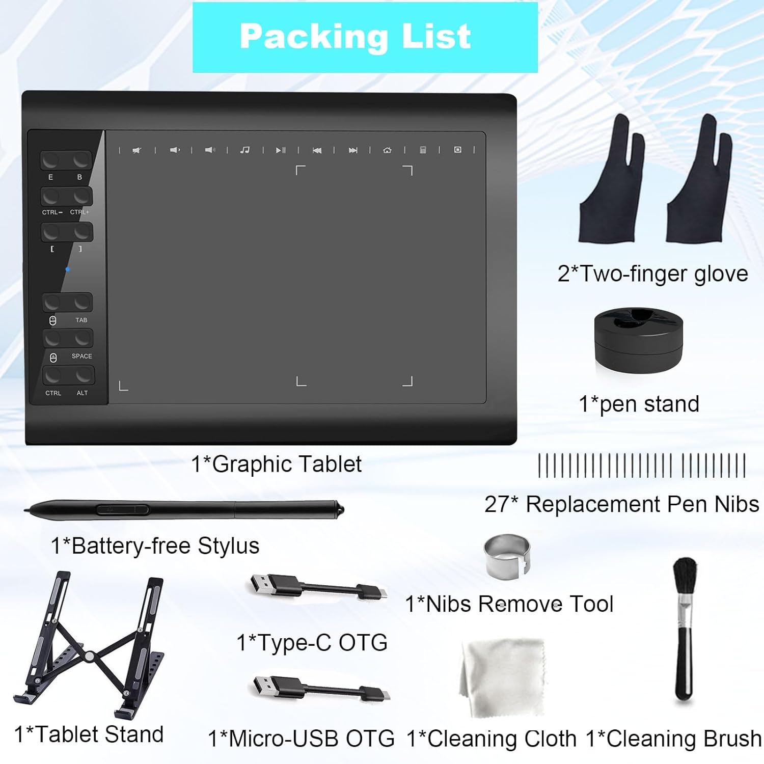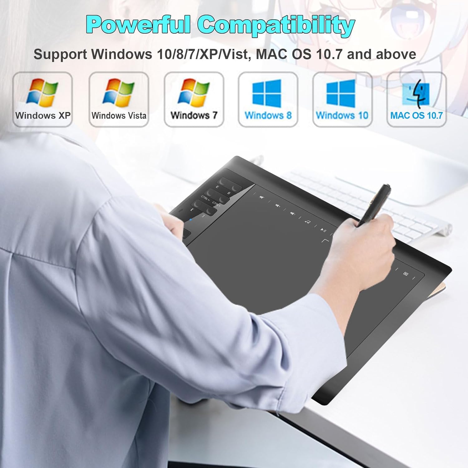 Widely used: The T1060 T1060 drawing tablet is very compatible with most of the main design creative software, such as Photoshop, SAI, Flipaclip, Medibang, Adobe Illustrator, Adobe Premiere, Lightroom, etc. It is a good option for professionals and beginners. It is also compatible with office software such as Microsoft Office, Excel, Power Point, is ideal for online teaching, remote work, web conference, etc.