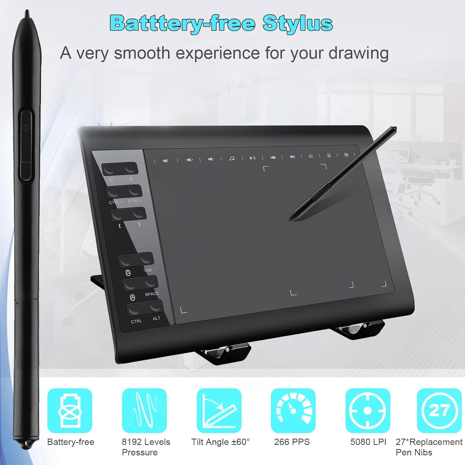 Style with inclination function: this digital graphic tablet equipped with a pen, without recharging and offers 30 PCs of Pen replacement; Characteristics The ± 60 ° inclination recognition for the precise positioning of the cursor at different angles to add shadows to their creations; It has 8192 pressure sensitivity levels for precise and soft control of the line thickness; It has a 266ppps report rate and a 5080LPI resolution