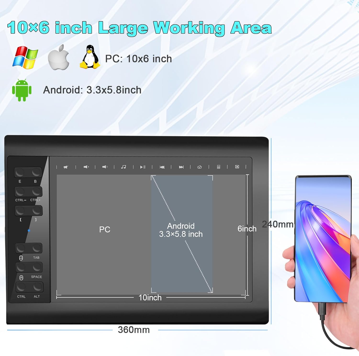 Large active drawing space: Terow T1060 PAD, the digital drawing pad has a large active 10 x 6 -inch drawing area, provides a large enough space for its creation of digital works of art; The drawing area is 3.3 x 5.8 inches when a mobile phone is connected
