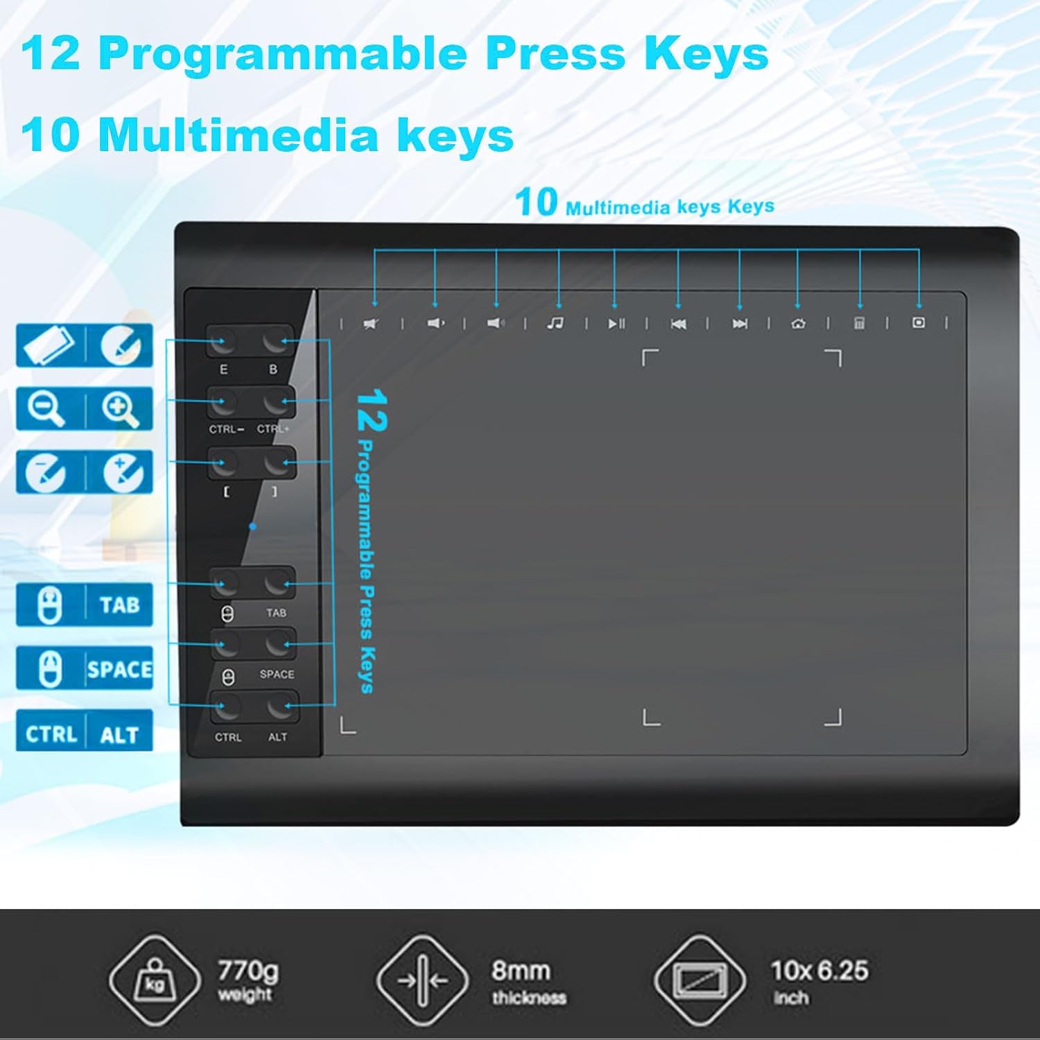 12 shortcut keys + 10 multimedia keys: This drawing pad has 12 customizable direct access keys on the side provide faster access to the most used functions, such as Eraser, insnible zoom, scroll and undo, save and eliminate, and so on; 10 multimedia keys in the upper part (only compatible for windows) such as silence, volume up and down, multimedia reproduction, game and pause, etc., it gives you more comfort