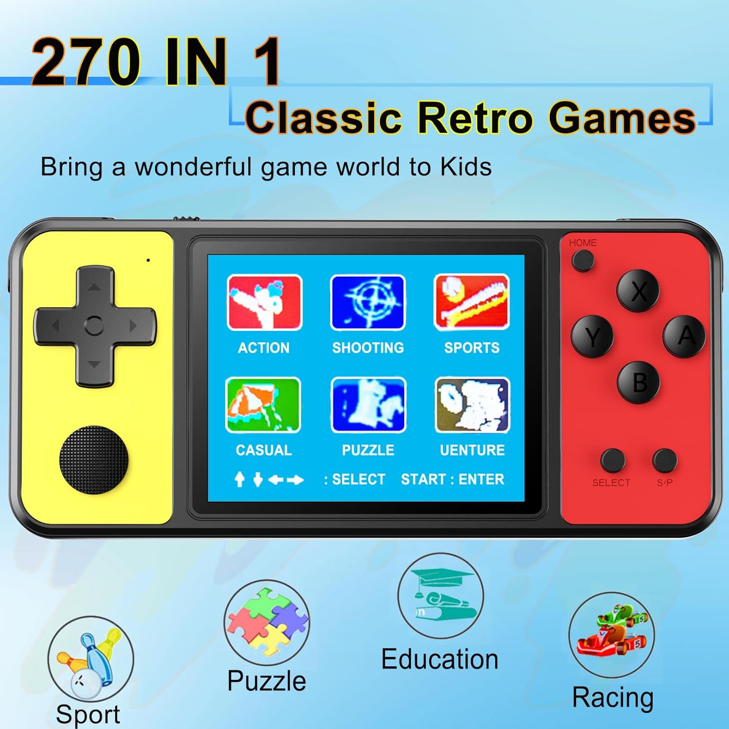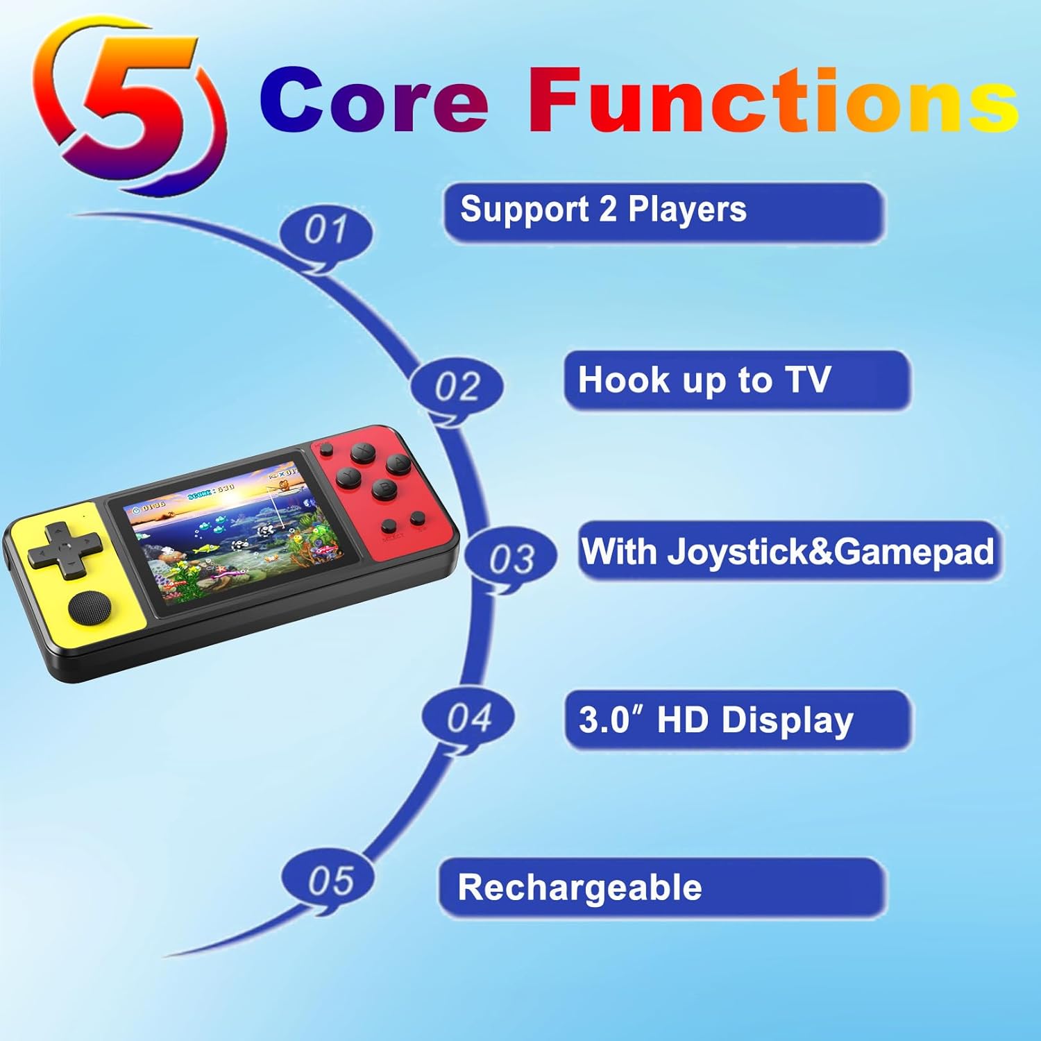 Novel design: This portable game console has an elegant colored block design. Free with 270 classic games preloaded and with a gamepad. One the Joystick with the same function as the direction button, you can experience the fun of Arcade.Link Gamepad and TV, you can also enjoy the games with your teammates.
