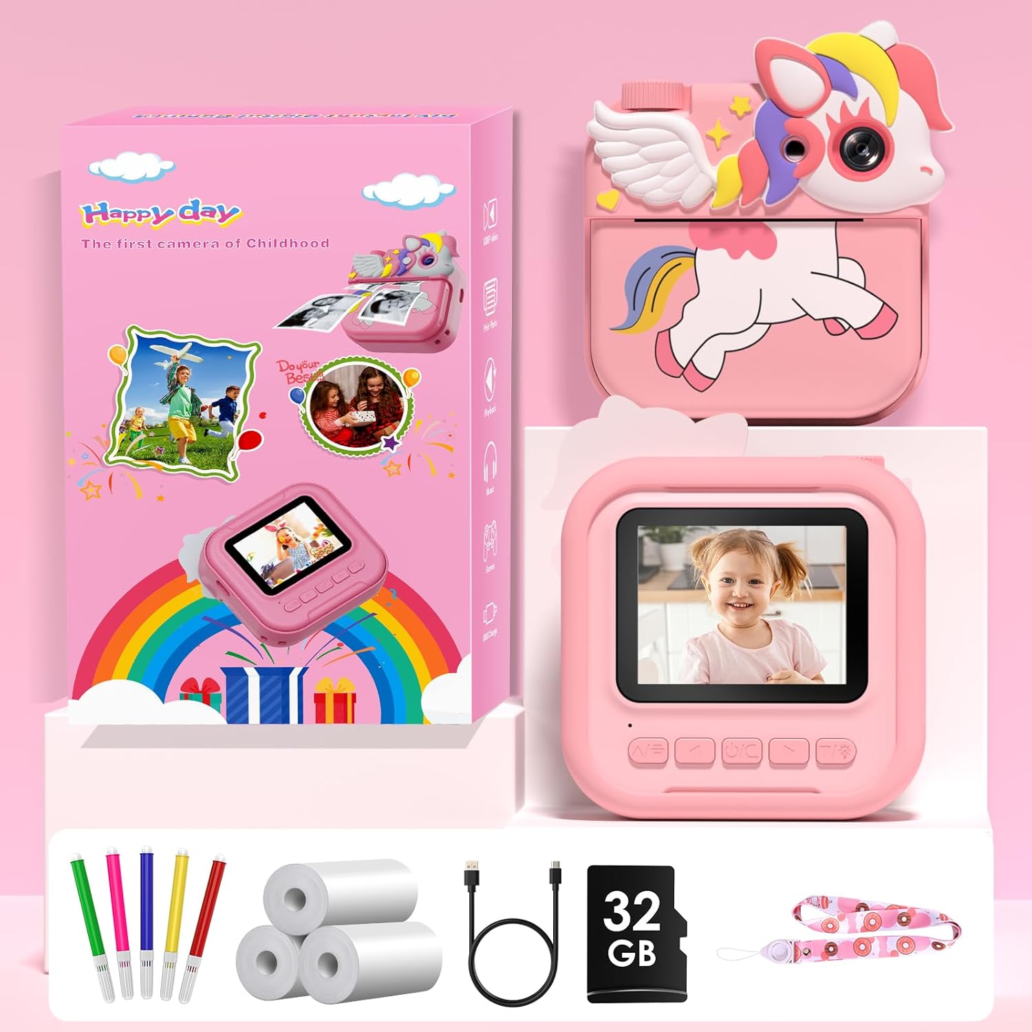 Package includes: 1 kids speed camera, 1 32GB memory card, 3 rolls of printing paper, 5 colored pencils, 1 lanyard, 1 USB cable, 1 cartoon stickers, 1 user cable; This kids camera is an ideal gift for kids ages 3, 4, 5, 6, 7, 8, 9, 10, 11, and 12! Suitable for birthday, New Year, Christmas, Thanksgiving, etc. This is a children's toy camera (not a high-end camera).