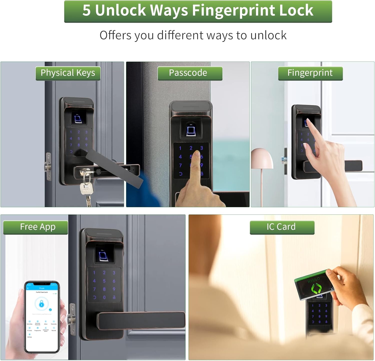 [5 in 1 Smart Door Lock] 5 Forms of unlocking: fingerprint + password + cards IC + Application control + physical keys. The fingerprint door lock supports remotely and works with Alexa/Google Assistant Support Voice Control (you need to match with Gateway, sold separately)