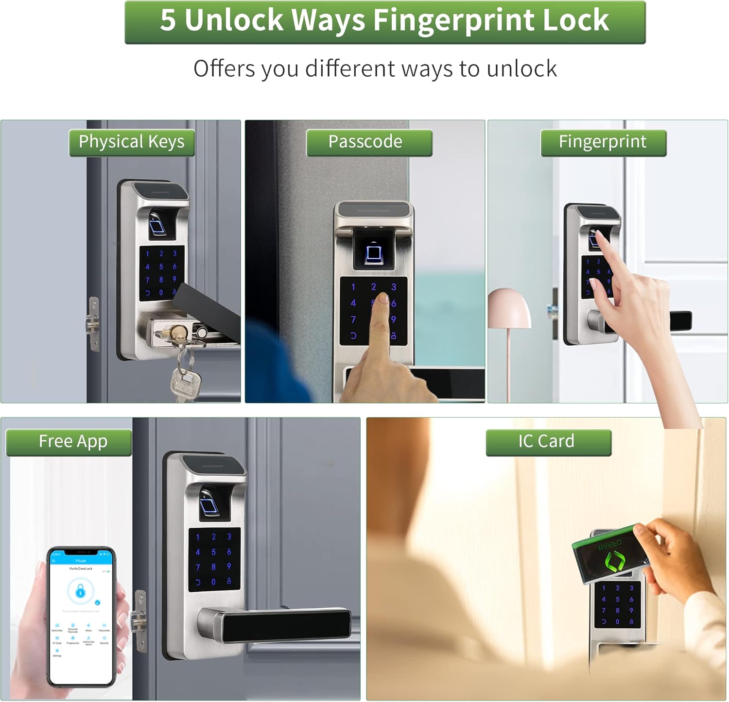 [5 in 1 Smart Door Lock] 5 Forms of unlocking: fingerprint + password + cards IC + Application control + physical keys. The fingerprint door lock supports remotely and works with Alexa/Google Assistant Support Voice Control (you need to match with Gateway, sold separately)