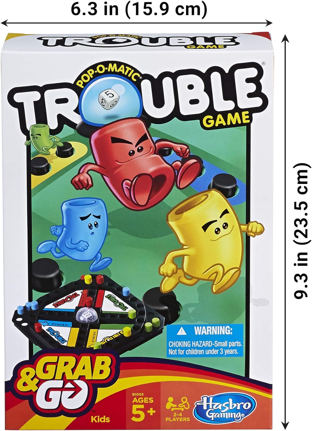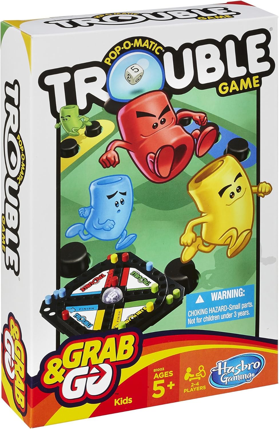 Uh-oh, it's time for Trouble on the go – Grab & Go! This travel version of the classic Trouble game has the same Pop-O-Matic dice roller, but it's smaller and more compact. Keep popping the dice and moving the tokens with each spin and you might just get all of your tokens across the finish line to win! When the game is over, simply place the tokens on their finish lines and close the lid for easy storage. Grab your Trouble and go have token-popping fun anytime, anywhere! Trouble and all related characters are trademarks of Hasbro.