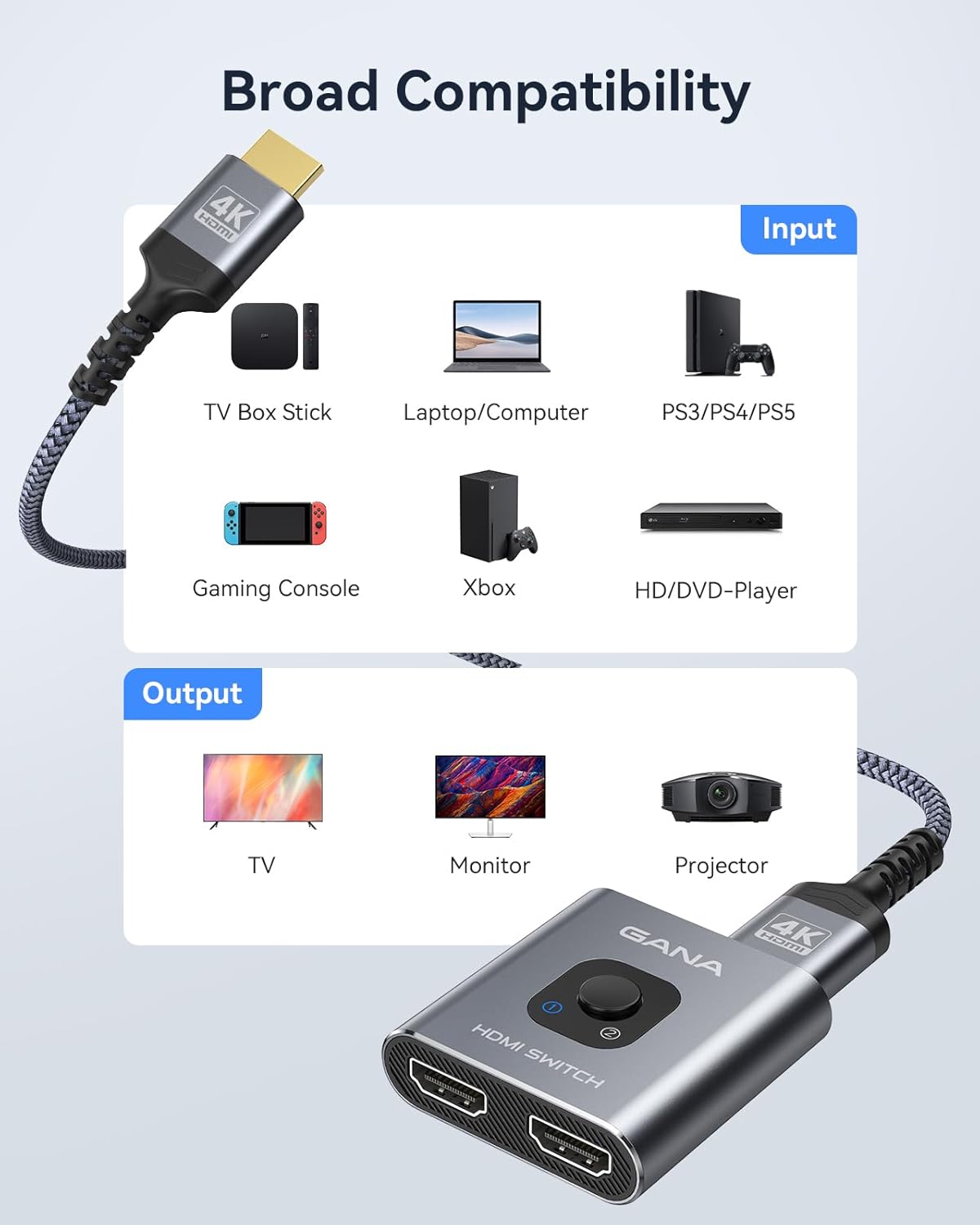 【Wide Compatibility】HDMI splitter switch compatible with most devices with standard HDMI port. Support input: computer, XBox 360, XBox One, compatible with PS5/4/3, Blu-Ray DVD player, etc. Output: televisions, monitors, projectors, etc. HD-Ready or Full HD.
