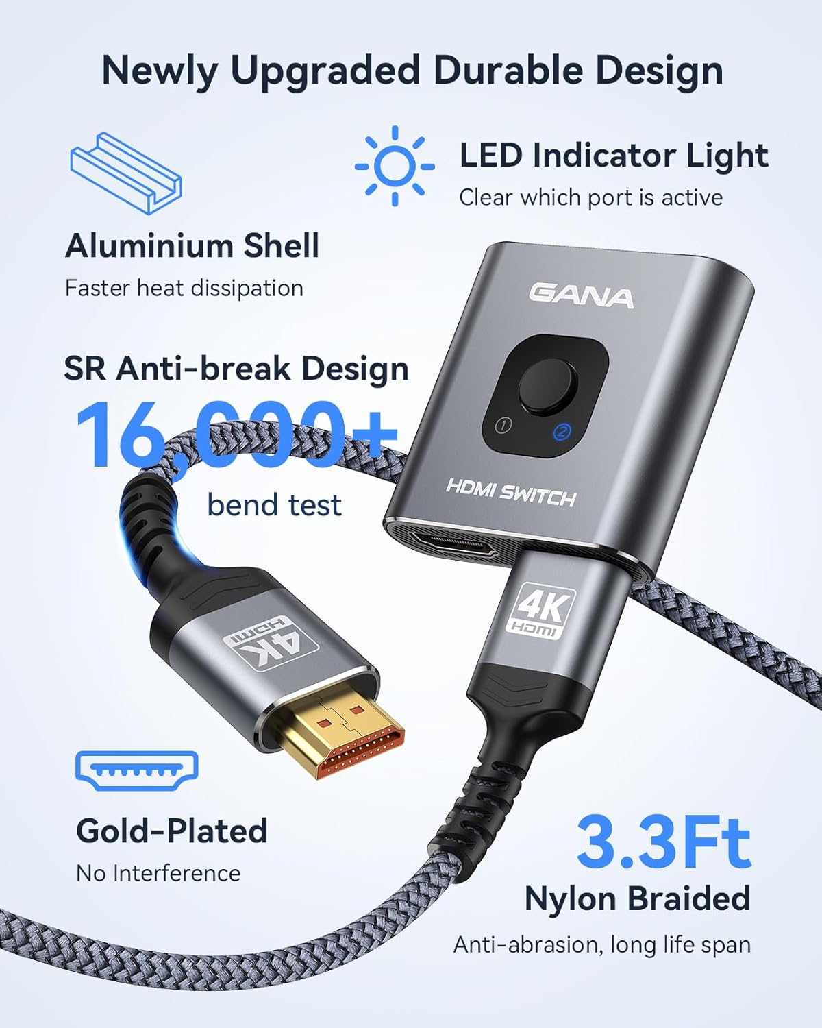 【Fast and Stable Transmission】This aluminum HDMI AB switch not only supports 3.4Gbps high bandwidth data transmission, but also ensures stable and high-definition display of audio and video, reduce transmission loss of data and improves signal transmission efficiency. HDMI cable NOT included