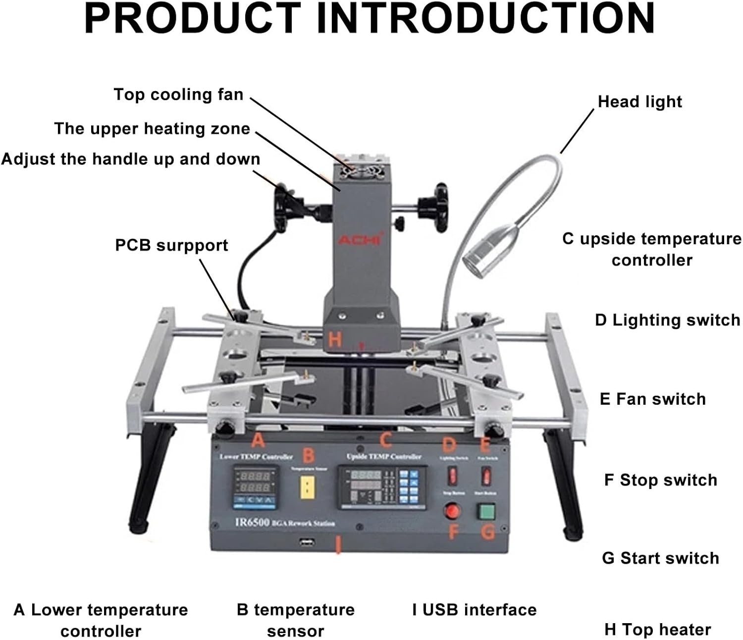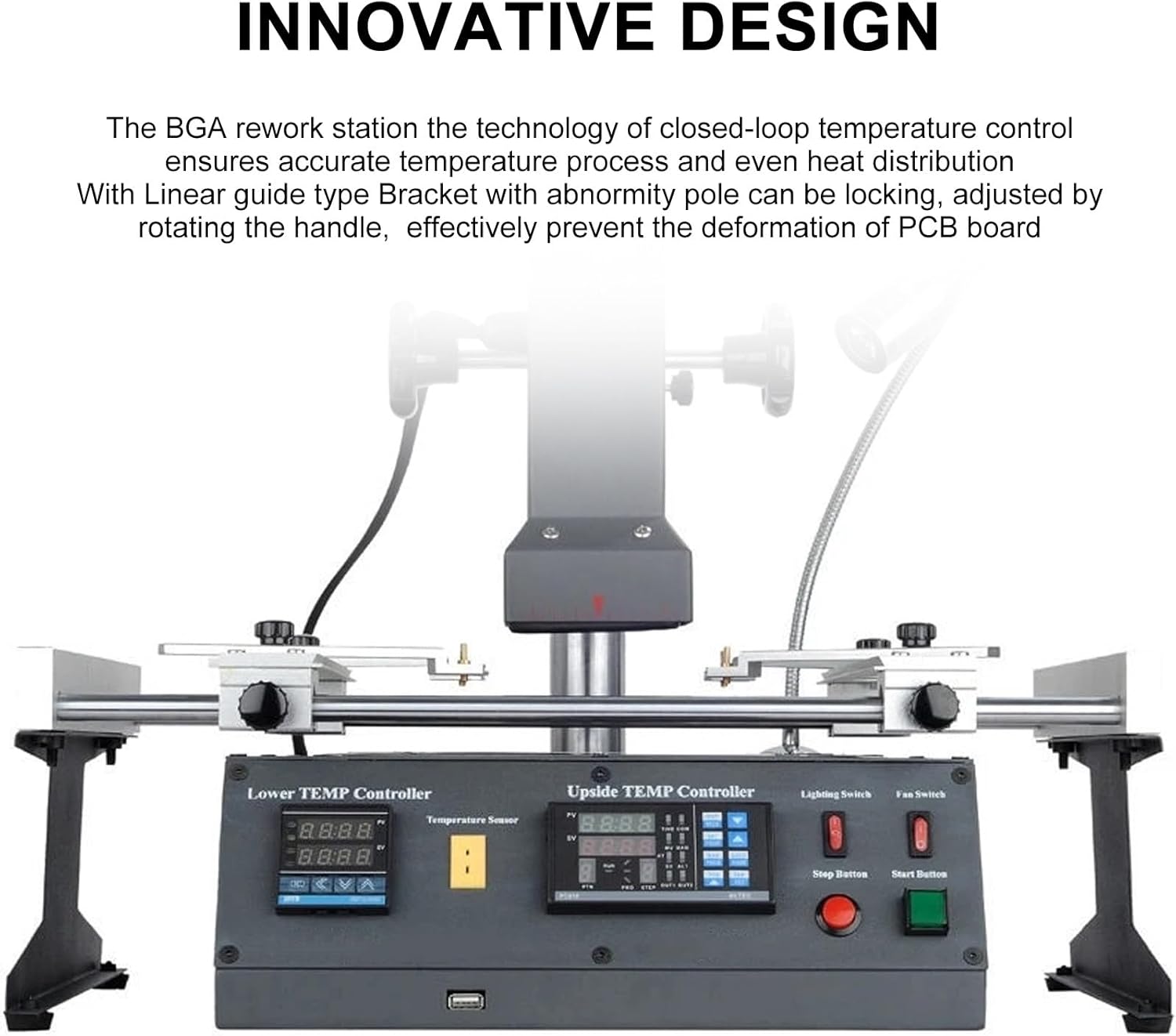 【INNOVATIVE DESIGN】This infrared heater innovatively designs an effective solution for general infrared rework stations vulnerable to airflow impact. It will lead to inaccurate temperature control which can easily deal with soldering rework. Linear guide type Bracket with abnormal pole can be locked, adjusted by rotating the handle, effectively prevent PCB board deformation